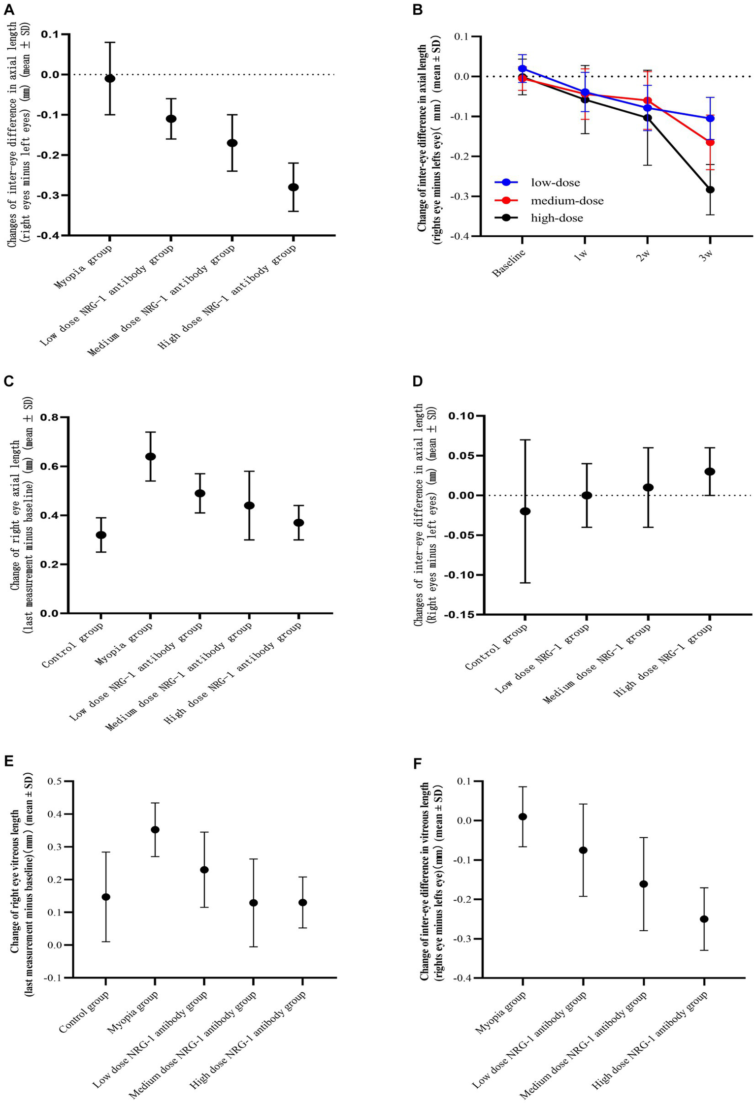 Inter-eye difference (right eye minus left eye) in axial length. (A) Inter-eye difference in axial length at study end in guinea pigs of the myopia group (binocular lens-induced myopization) and guinea pigs of the groups with intravitreal injections of NRG-1 antibody at various doses. (B) Inter-eye difference in axial length in guinea pigs of the various dose NRG-1 antibody groups during the study period. (C) Axial elongation in the right eyes at study end of guinea pigs of the myopia group (binocular lens-induced myopization) and guinea pigs of the groups with intravitreal injections of NRG-1 antibody at various doses. (D) Inter-eye difference in axial length at study end in guinea pigs of the control group and guinea pigs of the groups with intravitreal injections of NRG-1 protein at various doses. (E) Elongation of the vitreous cavity in the right eyes of guinea pigs at the end of the follow-up. (F) Inter-eye difference in vitreous length in guinea pigs at the end of follow-up.
