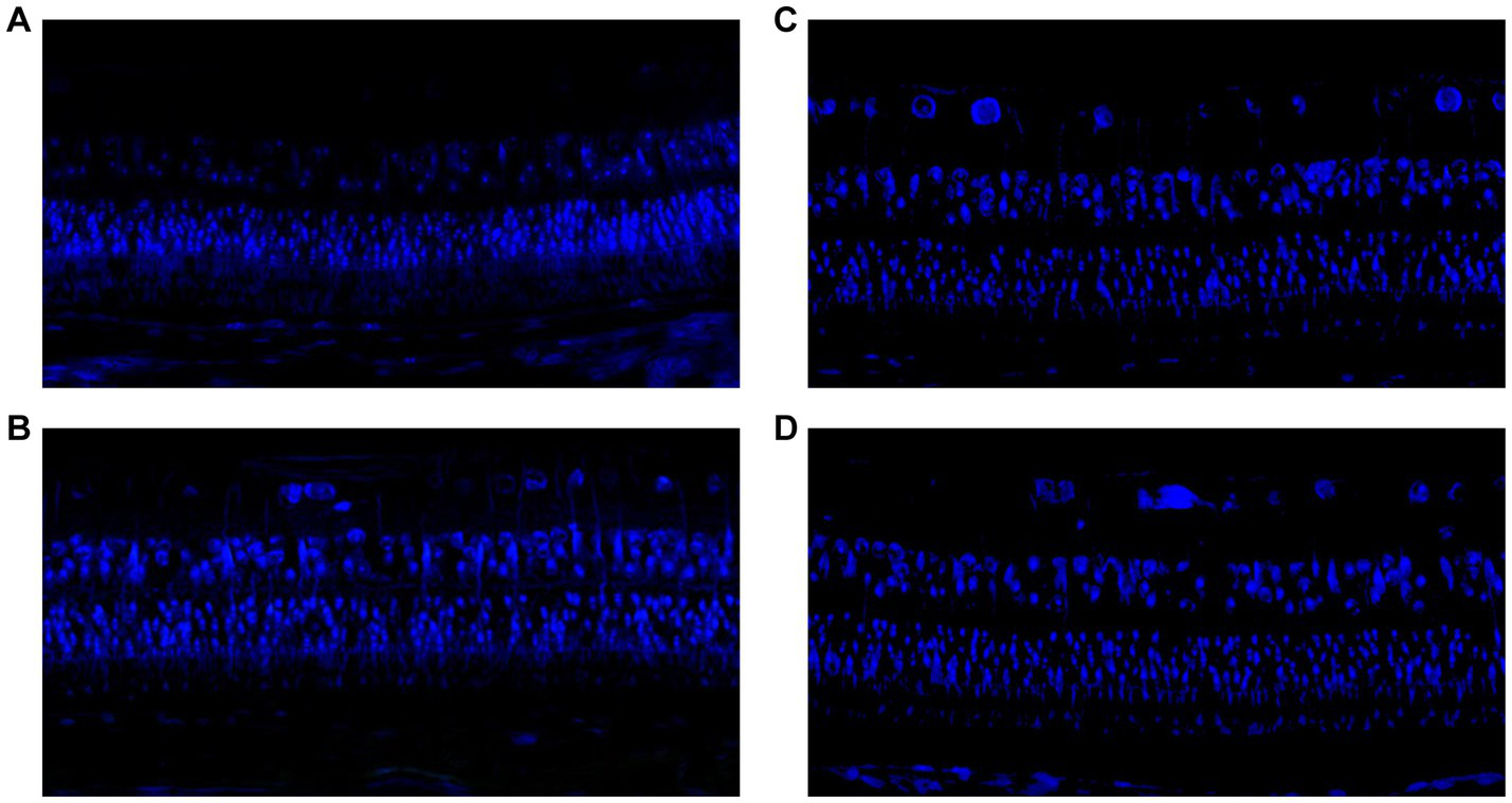 HE and TUNEL staining were performed as described previously (28). Apoptotic cells in the retinal tissue were identified through TUNEL staining using the Cell Death Detection Kit from Kaiji Biotechnology Co. Ltd., Jiangsu, China. Quantification was performed on the TUNEL-positive cells in the retina by photographing three sections from each eye. The average count from the three assessments was documented. On the histological sections, we measured the thicknesses of the retina and sclera at the posterior pole, at the equator, and close to the ora serrata under a light microscope (Olympus Co., Tokyo, Japan).