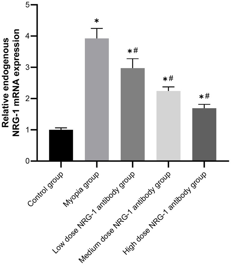 The inter-eye difference in axial length at study end increased (p < 0.001) from the normal control group (−0.02 ± 0.09 mm) and the myopia control group (−0.01 ± 0.09 mm) to the low-dose NRG-1 antibody group (−0.11 ± 0.05 mm), medium-dose NRG-1 antibody group (−0.17 ± 0.07 mm), and high-dose NRG-1 antibody group (−0.28 ± 0.06 mm). The relative expression of NRG-1, ERK1/2, and PI3K/AKT in the retina decreased in a dose-dependent manner from the myopia control group to the NRG-1 antibody groups and the normal control group. The relative NRG-1 mRNA expression in the retina was higher (p < 0.01) in the myopic control group than in the NRG-1 antibody groups and normal control group. Scleral and retinal thickness decreased from the normal control group to the NRG-1 antibody groups to the myopic control group. After intraocular injection of NRG-1 protein, there was a slight dose-dependent increase in the difference in axial length between the right and left eye, however not statistically significantly, from the normal control group (−0.02 ± 0.09 mm) to the high-dose NRG-1 protein group (0.03 ± 0.03 mm; p = 0.12).