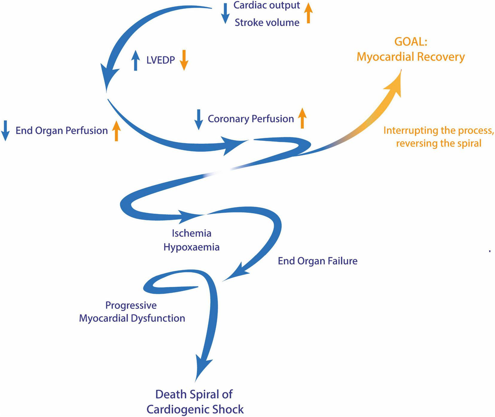 The death spiral of cardiogenic shock. Blue arrows represent the changes observed during the progression of cardiogenic shock, while yellow arrows depict the opposing changes achieved through effective and timely intervention. LVEDP, left ventricular end-diastolic pressure.