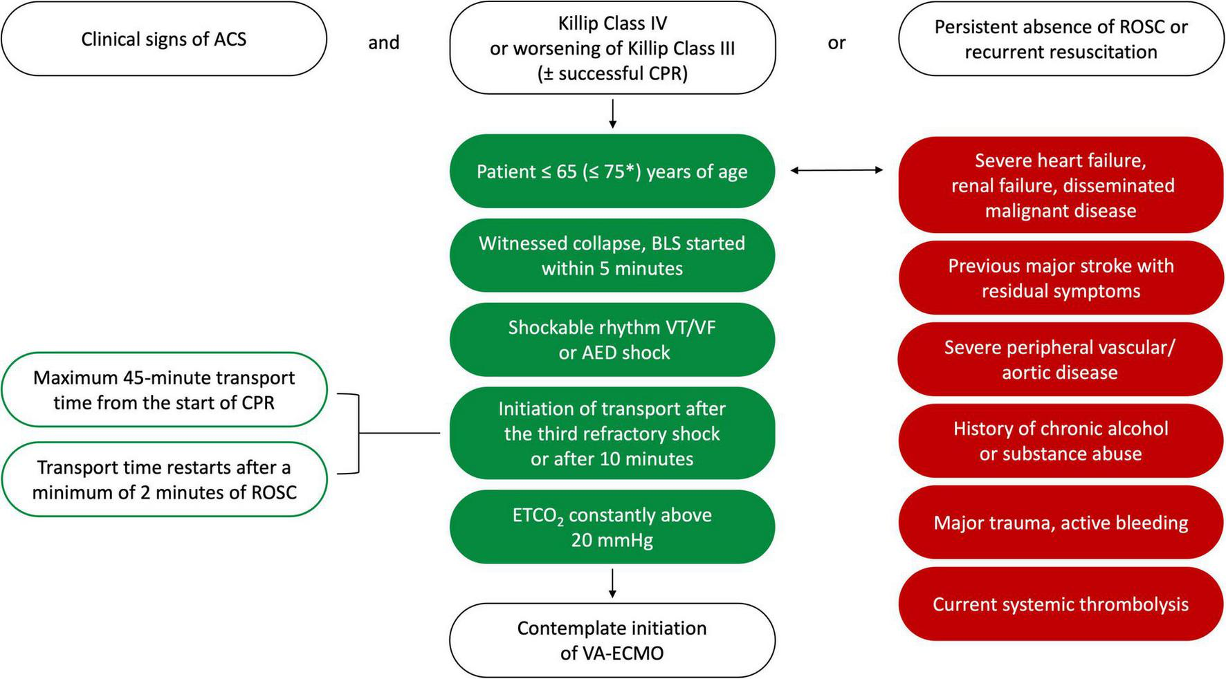 It is important to note that patients who require ongoing or recurrent CPR demand further attention to detail from the Shock Team, to individually determine eligibility criteria. Here the main objective is to establish if the patient has any medical chance of survival in case of pVA-ECMO support initiation. We recommend focusing on clinical and time-based parameters to establish appropriateness. Sudden death occurring due to ventricular arrhythmias (I) with minimal no-circulation time, quick initiation of basic life support (II), and high exhaled CO2 levels (III) are important hallmarks of potential benefit from MCS. Furthermore, especially during ongoing advanced life support (ALS), transport time constraints play a crucial role, regarding the initiation of transport to the shock center (IV) and the transport time itself (V).