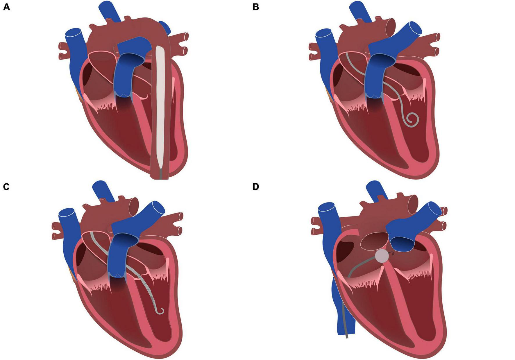 Left ventricular unloading methods during VA-ECMO treatment. (A) Intra-aortic balloon pump (IABP); (B) Pigtail catheter; (C) Microaxial transvalvular assist device (Impella); (D) Interatrial septostomy.
