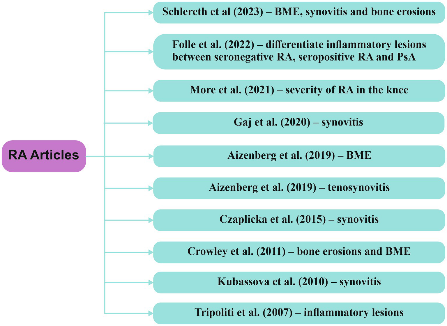 Figure 5. Research articles exploring computer-based techniques, with a focus on AI, in the analysis of MRI data within RA RA/rheumatoid arthritis, BME/bone marrow edema, PsA/psoriatic arthritis.