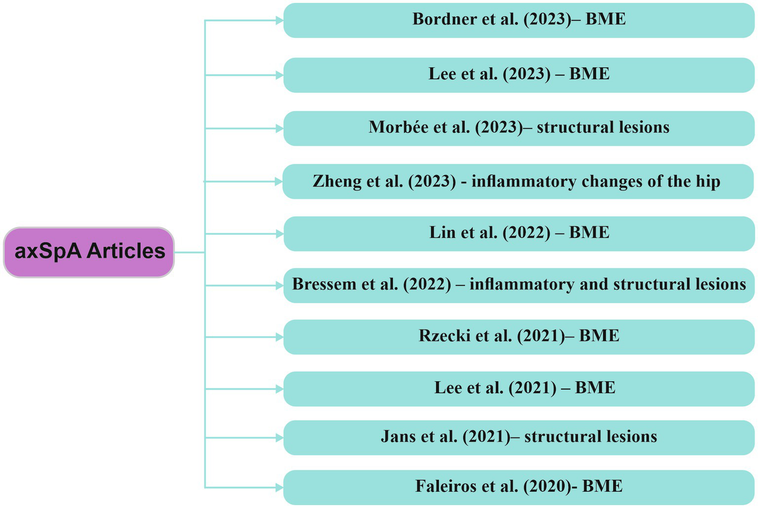 Figure 6. Research articles exploring computer-based techniques, with a focus on AI, in the analysis of MRI data within axSpA axSpA/axial spondyloarthritis, BME/bone marrow edema.