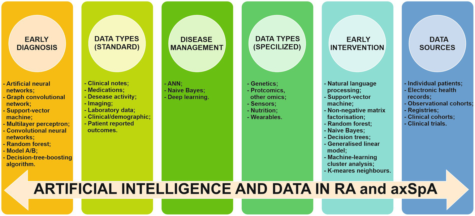 Figure 7. Implication of AI, data types and data sources in early diagnosis, early intervention and disease management of RA and axSpA RA/rheumatoid arthritis. axSpA/axial spondyloarthritis, ANN/artificial neural networks.