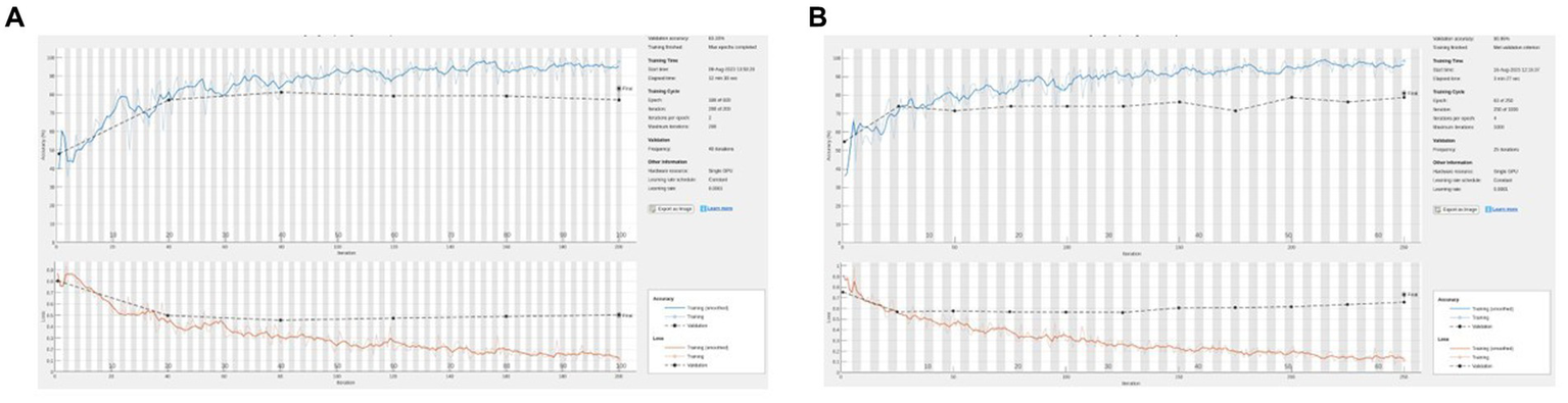 (A) Representative training graph for naive (no hue augmentation) middle finger PIP. On this run, accuracy = 83%, sensitivity = 77%, and specificity = 88%. (B) Representative training graph for naive (with hue augmentation) MFPIP. On this run, accuracy = 81%, sensitivity = 65%, and specificity = 92%.
