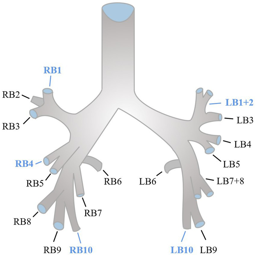 Quantitative CT measurements were evaluated using the COPD Analysis package (Philips IntelliSpace Portal). The extent of emphysema was quantified by evaluating the areas of the lung with attenuation less than −950 Hounsfield units (HU) at full inspiration, commonly referred to as LAA-950 (10). We used an integral-based method for airway measurements (11). To calculate the segmental airway measurements, the average of five segmental airways (RB1, RB4, RB10, LB1+2, and LB10) along the middle third of each airway was taken (10, 12), the anatomy of normal segmental bronchi was shown as Figure 2. The segmental wall area percentage (WA%) was determined by taking the average of the five segmental airways and calculating (WA/total cross-sectional area) × 100. Pi10, which was assessed from the regression line calculated by plotting the square root of the wall area and the lumen perimeter of the airway, was defined as the square root of the wall area of a theoretical airway with a lumen perimeter of 10 mm (13).
