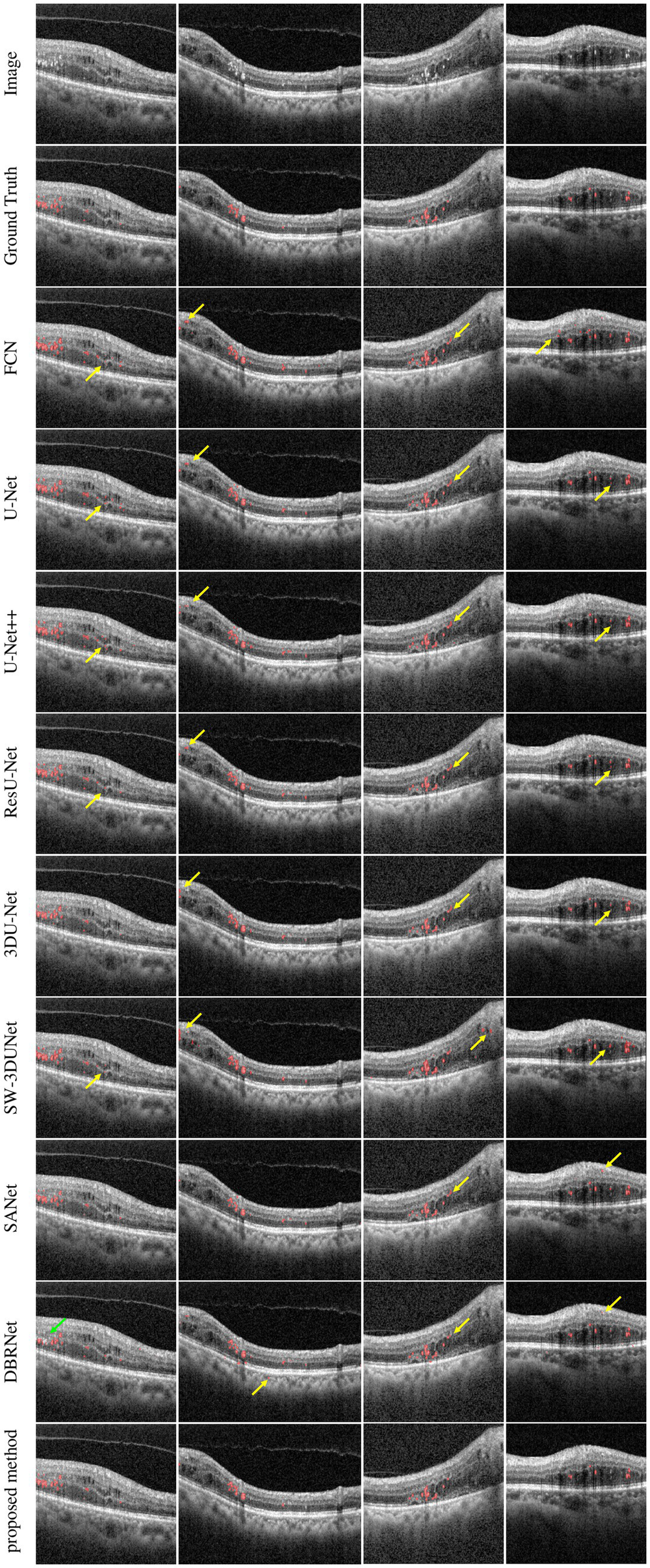 Comparison between the proposed SW-3DUNet and other methods. Yellow and green arrows represent the regions of over-segmentation and under-segmentation. B-scans in the second column are taken from fovea-centered regions of 6 × 6 mm2, while B-scans in the other columns are taken from fovea-centered regions of 4.5 × 4.5 mm2.