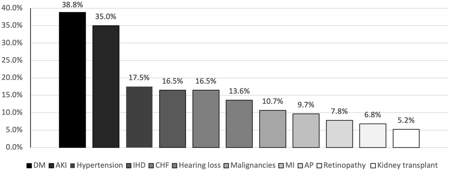 The most common comorbidity in the study sample was DM which was found in 38.8% of patients, followed by hypertension (17.50%), CHF and ischemic heart disease (IHD) both accounted for a percentage of 16.5% (Figure 2).
