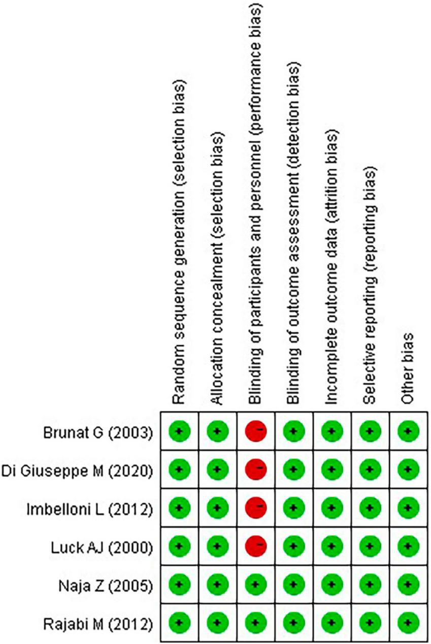 Figures 2, 3 present the results of the Cochrane risk of bias tool. Considering the nature of the intervention, all studies were not conducted blind analysis of researchers.