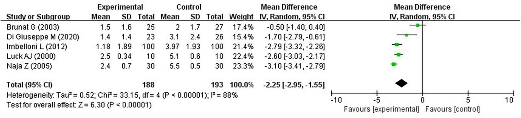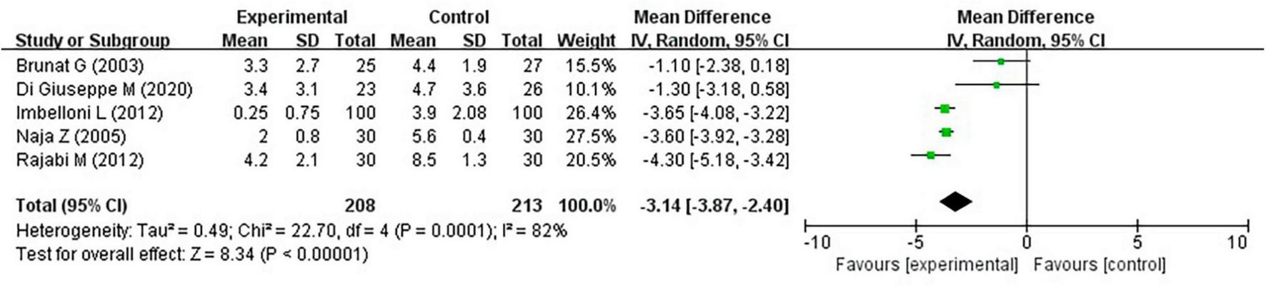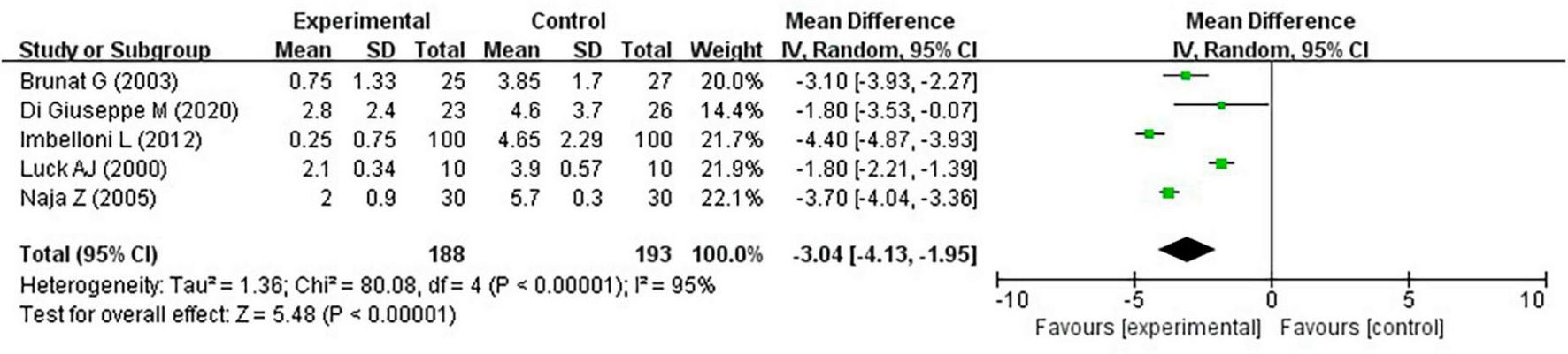 Brunat et al. (17), Di Giuseppe et al. (21), Imbelloni et al. (19), Naja et al. (18), and Rajabi et al. (20) reported that the VAS score at 12 h after hemorrhoidectomy was lower in the experimental group than in the control group (MD, −3.14; 95% CI, −3.87 to −2.40; P < 0.0001; I2 = 82%) (Figure 5).
