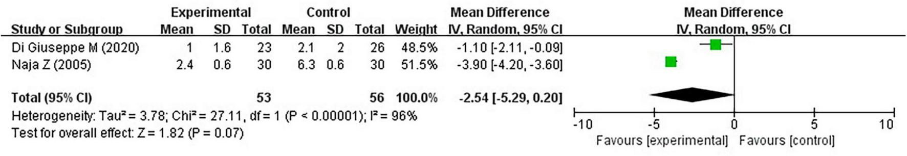 However, at 48 h after hemorrhoidectomy, Di Giuseppe et al. (21) and Naja et al. (18) reported no difference in VAS scores between the experimental and control groups (MD, −2.54; 95% CI, −5.29 to 0.20; P = 0.07; I2 = 96%) (Figure 7).