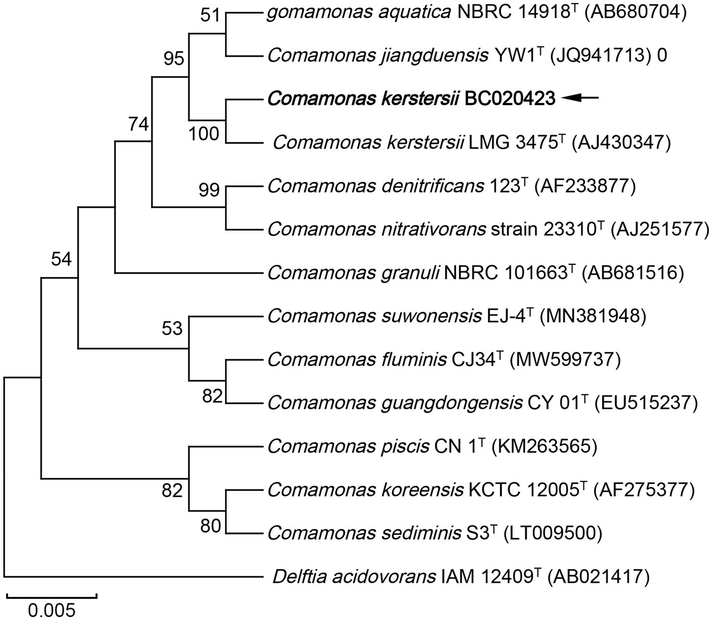 Phylogenetic tree based on the 16S rRNA gene sequences showing the relationship of isolated strain BC020423 (black arrow) and members within genus Comamonas. The tree was reconstructed by the neighbor-joining method, and Delftia acidovorans IAM 12409T (AB021417) was used as an outgroup. Bootstrap values (>50%) based on 1,000 replicates are shown at branch nodes. T, type strain.