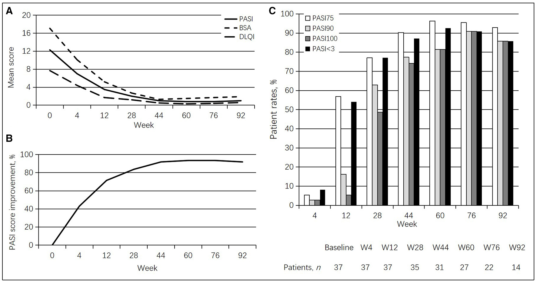 A total of 37 patients were included (29 men, 78.4%), with a mean follow-up period of 72.3 ± 26.7 weeks (range of 12–108 weeks). At baseline, clinical examination revealed a mean PASI of 12.3 ± 7.1, a mean BSA of 17.1 ± 18.1, and a mean DLQI of 7.7 ± 4.3. Twenty-two (62.9%) and 17 (48.6%) cases achieved PASI 90 and PASI 100 responses at week 28. From weeks 60 to 92, >80% of cases achieved PASI 90 and PASI 100 responses. Regarding safety, no cases of serious AEs were recorded. A total of nine cases (24.3%) had different abnormal results in HBV markers, and two were T-SPOT positive. There was no hepatitis B virus or tuberculosis outbreak in these patients.