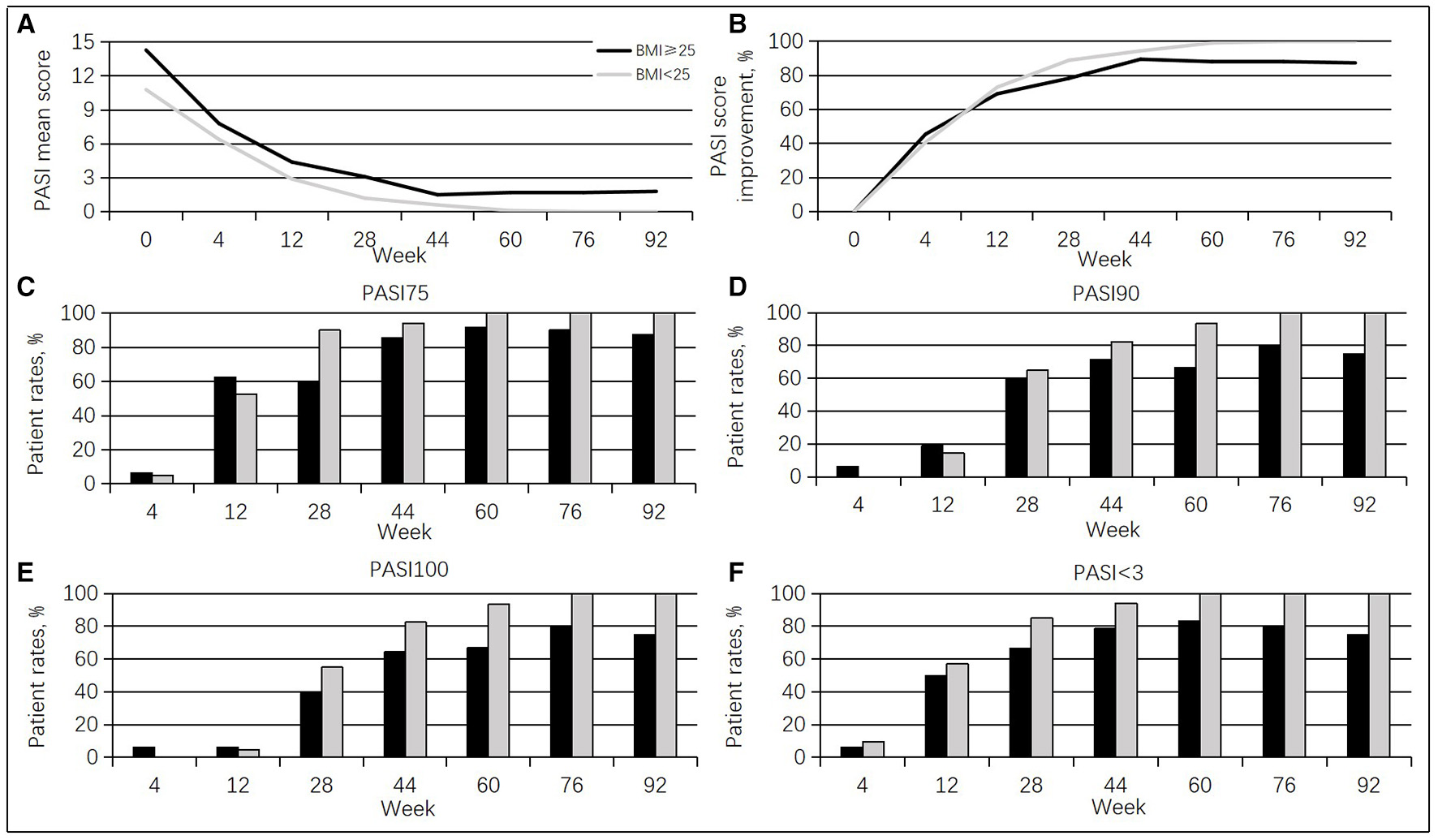 Guselkumab's efficacy between the BMI ≥ 25 group and the BMI < 25 groups. (A) Changes in mean PASI scores. (B) Percentages of mean PASI score improvement. (C) Rates of cases achieving a PASI 75 response at different times. (D) Rates of cases achieving a PASI 90 response at diverse times. (E) Rates of cases achieving a PASI 100 response at diverse times. (F) Rates of cases achieving a PASI < 3.0 response at diverse times.