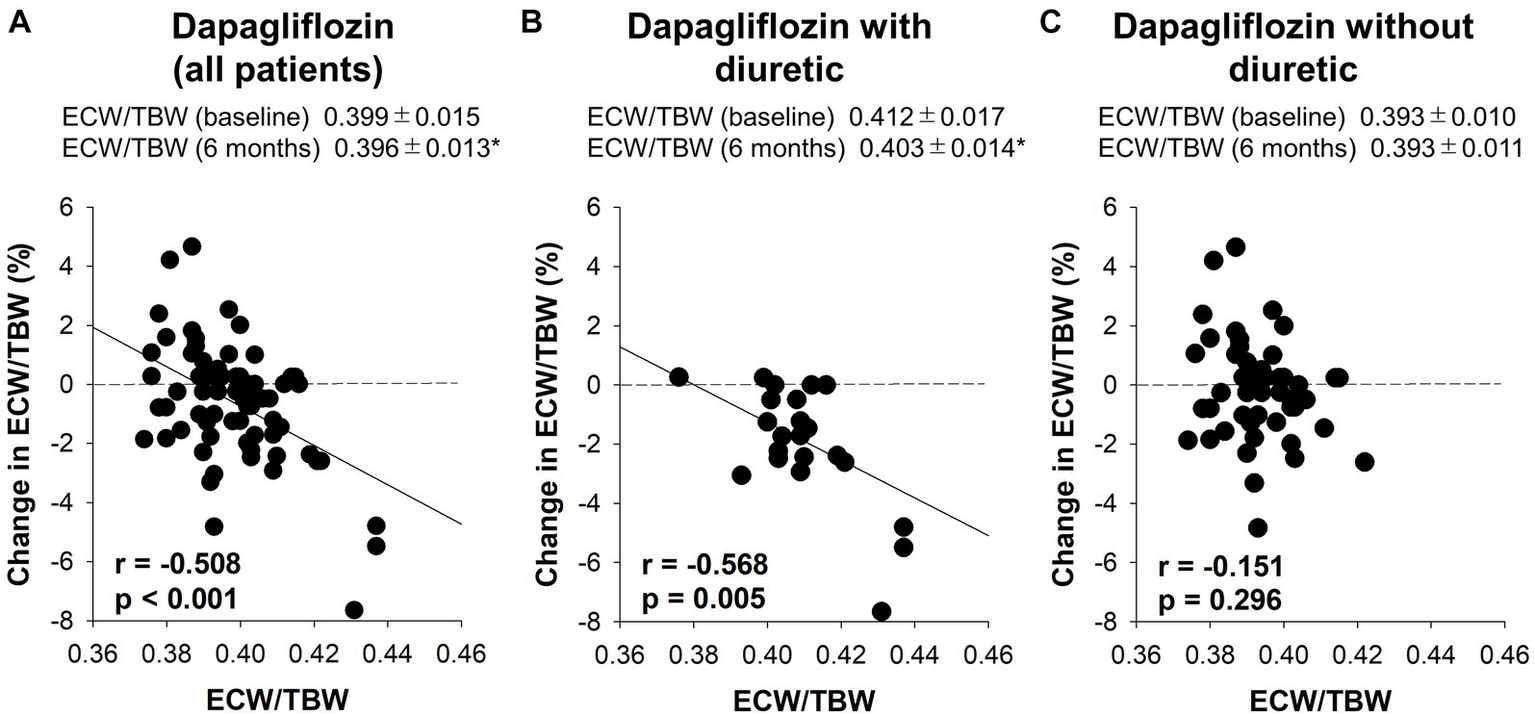 Dapagliflozin-treated patients were further divided into fluid retention (+) and fluid retention (−) groups. Body weight, body mass index, prevalence of diabetes, hemoglobin, hematocrit, serum albumin, eGFR, ICW, and fat mass were significantly higher in the fluid retention (−) group than in the fluid retention (+) group (Table 2). In contrast, age, brain natriuretic peptide (BNP), blood urea nitrogen, serum creatinine, urine proteinuria, ECW/TBW, and percentages of concomitant diuretic use (loop diuretic and thiazine), tolvaptan, and calcium channel blocker were significantly higher in the fluid retention (+) group than in the fluid retention (−) group (Table 2).