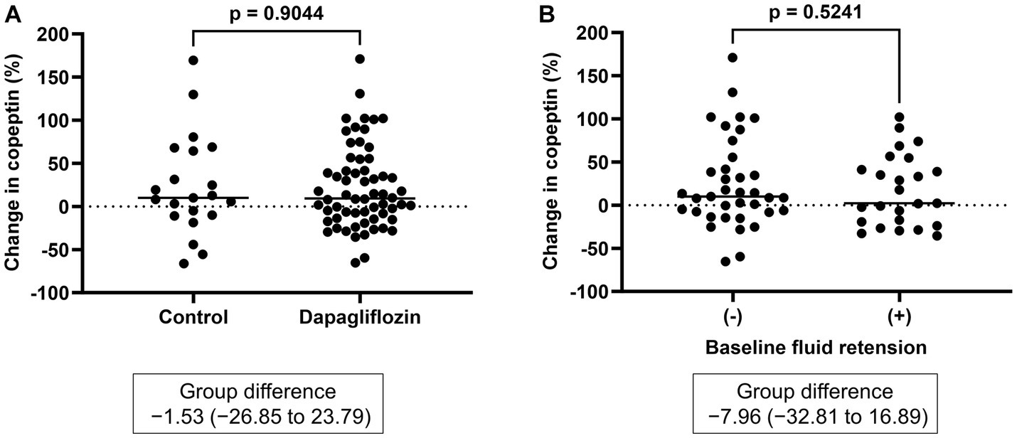 This prospective, non-randomized, open-label study analyzed 97 patients with CKD at the Shin-Oyama City Hospital (Oyama, Tochigi, Japan) and Nasu Minami Hospital (Nasukarasuyama, Tochigi, Japan) between February 2016 and August 2022. At the time of entry, 101 patients had received dapagliflozin (dapagliflozin group), while 29 patients had not received dapagliflozin (the control group; Supplementary Figure S1). In the dapagliflozin group, 28 patients were excluded from the final analysis for the following reasons:12 who were lost to follow-up, 5 with incomplete bioimpedance analysis (BIA) data, 4 who started dialysis, 3 who discontinued dapagliflozin (1 for appetite loss, 1 for skin pruritus, 1 for refusal of medication), 3 who died (2 with heart failure, 1 in a traffic accident), and 1 due to lack of a stored serum sample. In the control group, 5 patients were excluded from the final analysis due to the following reasons:3 who were lost to follow-up, 1 who started dialysis, and 1 who started dapagliflozin. Finally, 73 patients received dapagliflozin (5 mg, n = 15, 10 mg, n = 58), whereas 24 patients did not receive dapagliflozin as a control group. The entry criteria were as follows: (1) an estimated glomerular filtration rate (eGFR) of >15 but <59 mL/min/1.73 m2 with or without proteinuria or (2) eGFR >60 mL/min/1.73 m2 with proteinuria. Treatment drug (use or non-use of dapagliflozin) was determined according to the judgment of the attending physicians. The main indication for dapagliflozin administration is diabetes or chronic glomerular nephropathy, as dapagliflozin induces favorable renal outcomes in these patients (10, 31). Drug selection primarily depended on the cause of CKD, which reduced the possibility of bias. The exclusion criteria were a history of renal replacement therapy, current dialysis, type 1 diabetes, active malignancy, and implanted pacemakers. The observation period after administration was 6 months. Diuretics were not discontinued at the time of entry and dose changes in concomitant medications were made at the discretion of the attending physician during the study period.