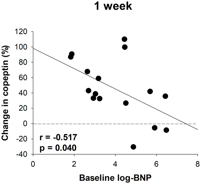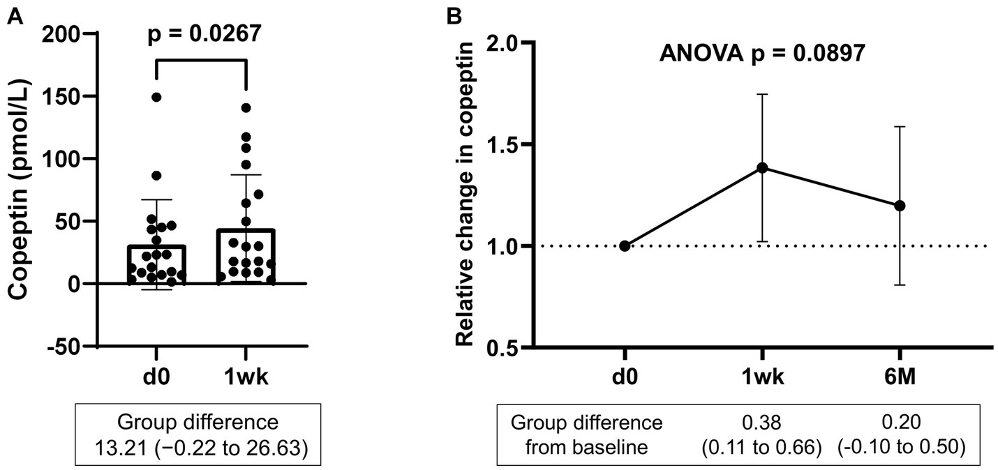 The data are expressed as mean (standard deviation). Paired or unpaired t-tests were used to compare two variables, as appropriate. The normality of the data distribution was determined using the Shapiro–Wilk test. Non-normally distributed data are presented as medians and interquartile ranges, and Wilcoxon’s rank sum test was used for between-group comparisons. Correlations between variables were analyzed using Pearson’s correlation test. Repeated measures analysis of variance was performed to identify statistically significant differences in copeptin measurements among the three time points (baseline, 1 week, and 6 months). Patients without complete BIA data at baseline and 6 months were excluded from the final analysis. The JMP 14.3.0 statistical software program (SAS Institute, Inc., Cary, NC, United States) was used for statistical analyses. Statistical significance was set at p < 0.05.