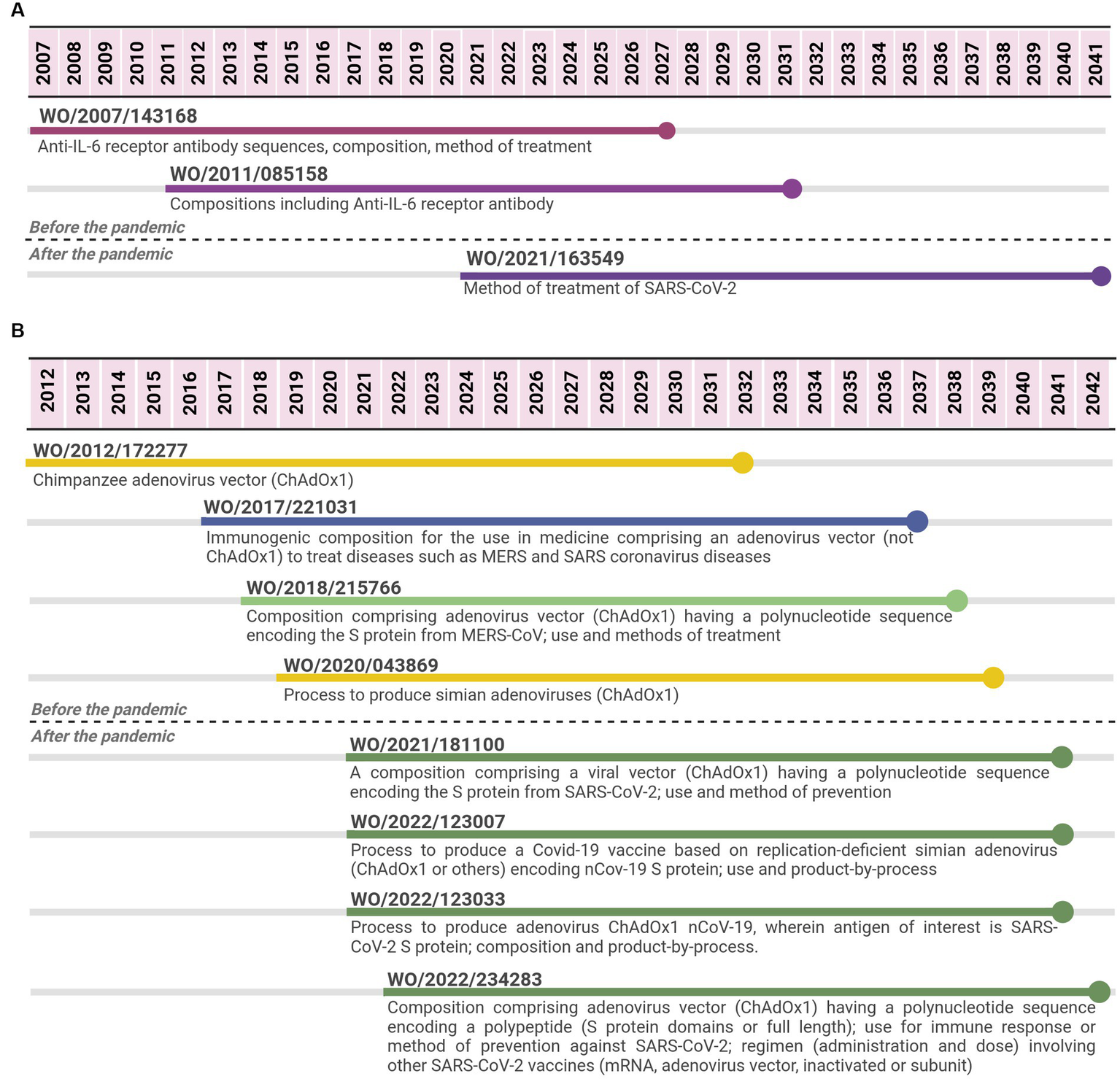 Timeline of potential patent protection related to sarilumab (A) and to Oxford-AstraZeneca viral vector vaccine (B). The selection was based on international patent applications filed under the PCT system and estimates built on a 20-year patent term. The international patent applications are aligned according to the international filing date. Reference for Oxford vaccine color code (used in B): related to the adenovirus vector ChAdOx1 (yellow); related to the viral vector platform applied for coronaviruses diseases (blue); related to adenovirus vector (ChAdOx1) encoding spike protein from MERS-CoV (light green); related to adenovirus vector (ChAdOx1) encoding spike protein from SARS-CoV-2 (first-generation vaccine) (dark green).