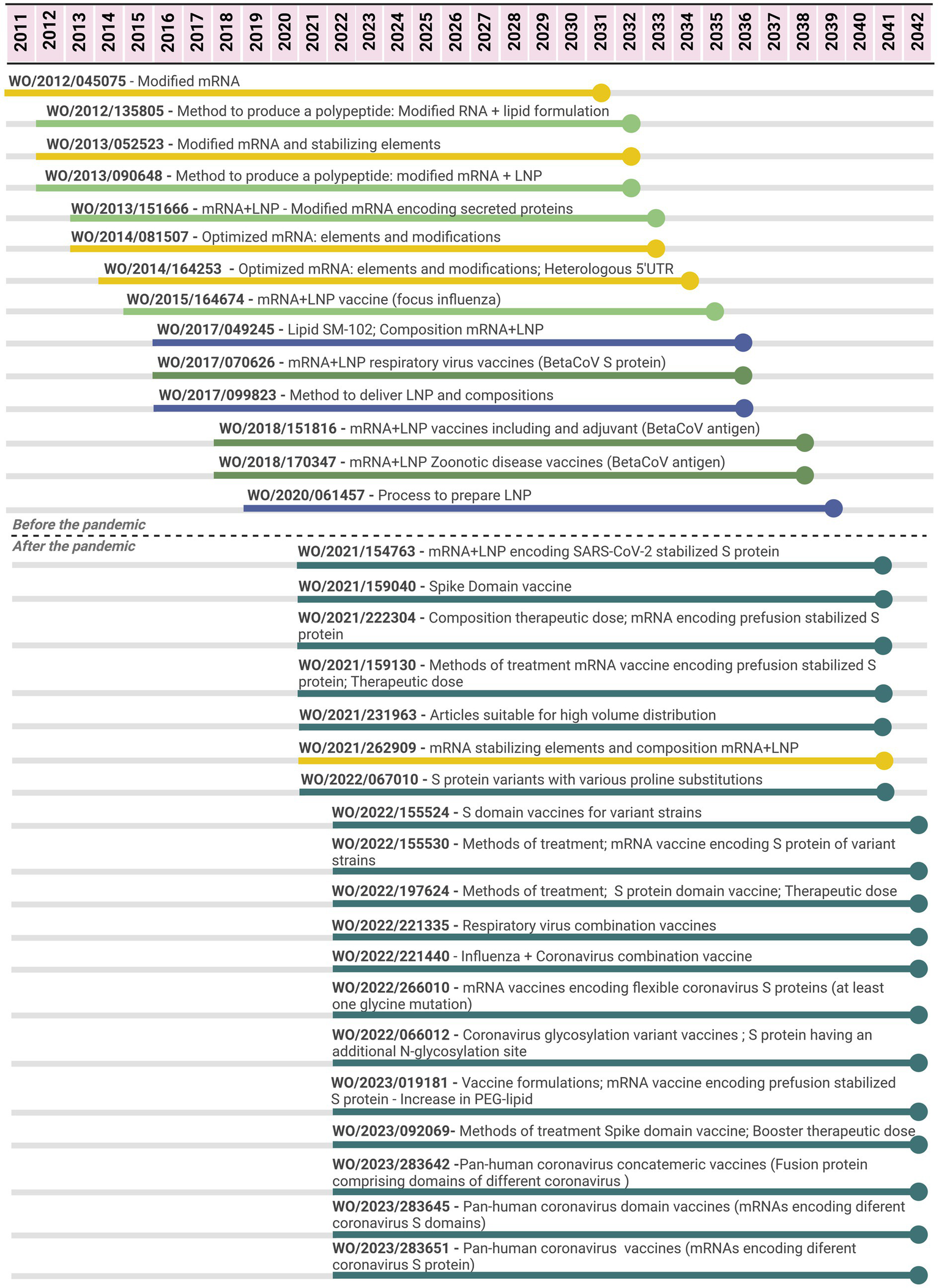 Timeline of potential patent protection related to mRNA-1273 vaccine developed by Moderna. The selection was based on international patent applications filed under the PCT system and estimates built on a 20-year patent term. The international patent applications are aligned according to the international filing date. Color code: related to the mRNA elements and modifications (yellow); related to delivery compounds and compositions (blue); related to the mRNA + LNP platform (light green); related to the mRNA + LNP platform applied for coronavirus diseases (medium green); related to the mRNA + LNP platform applied for SARS-CoV-2 (dark green).
