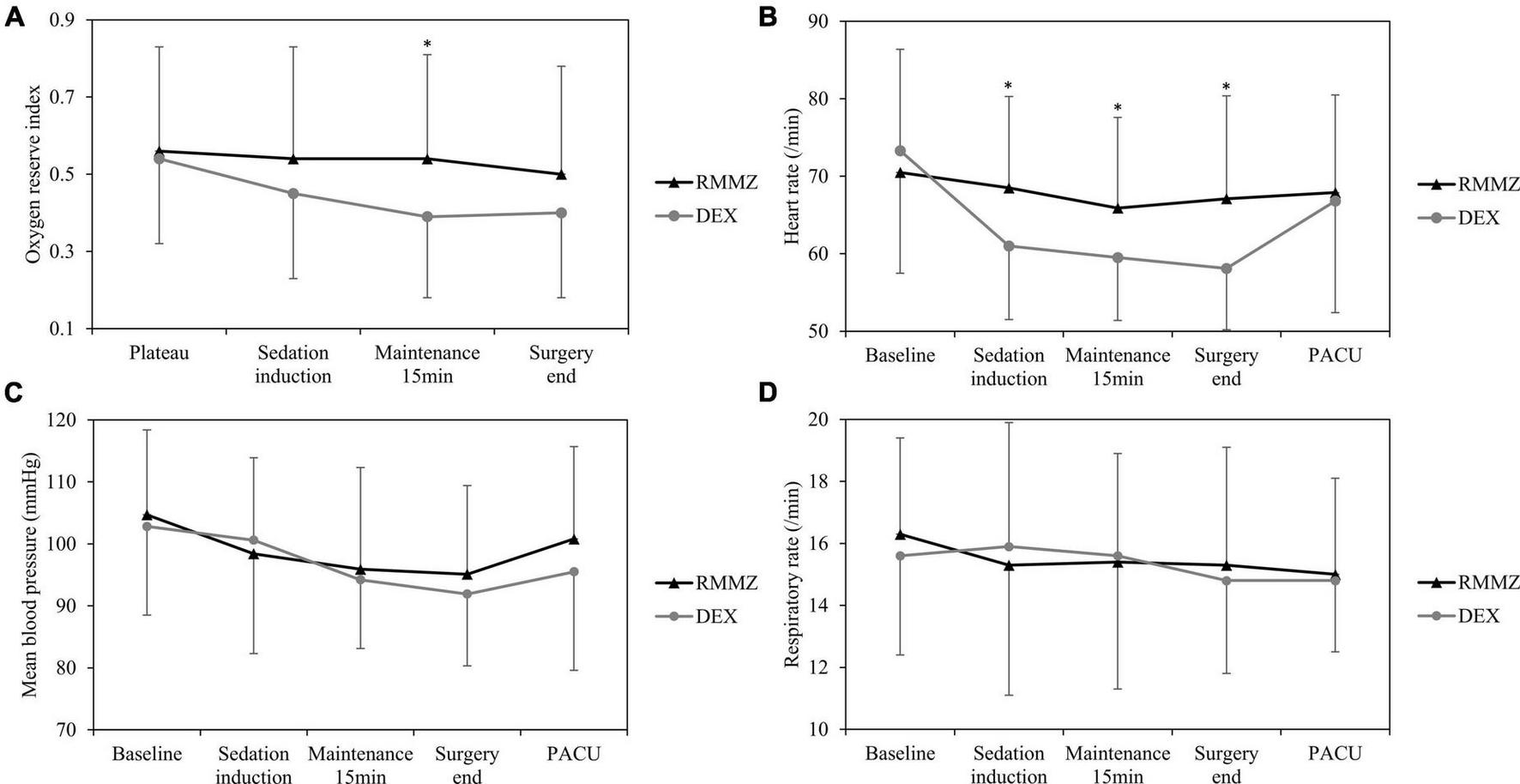 Perioperative (A) oxygen reserve index (ORi), (B) heart rate, (C) mean blood pressure, and (D) respiratory rate. Plateau means the maximum value of ORi in the preoxygenation stage. Sedation induction means after induction of sedation. Maintenance 15 min means 15 min after maintenance of sedation. *Significant differences. RMMZ, remimazolam; DEX, dexmedetomidine; PACU, post-anesthesia care unit.