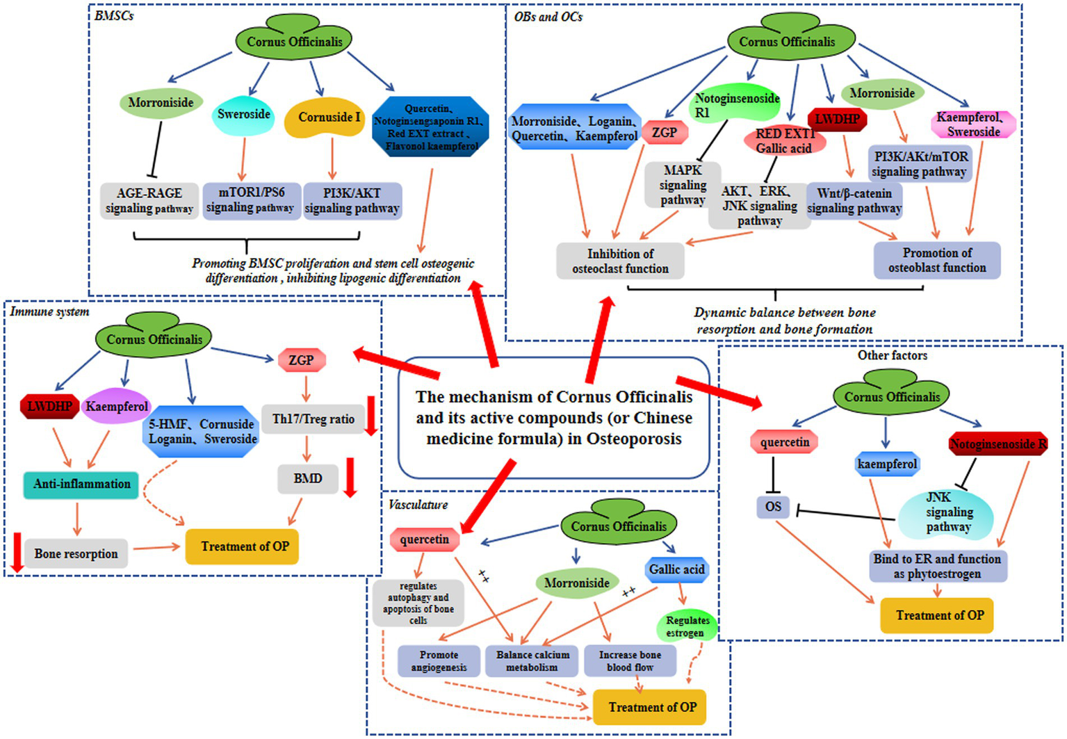 The aforementioned findings, presented in Table 1, support the notion that promoting BMSC proliferation and osteogenic differentiation, inhibiting lipogenic differentiation, enhancing osteogenesis related protein such as BMP2, Osx, RUNX2, ALP, OPN, OCN by regulating Wnt/β-catenin, BMP, PI3K/AKT/mTOR, AMPK, JNK, ERK, NF-κB signaling pathways represent promising therapeutic strategies for the treatment of OP mediated by the efficacious components of Cornus officinalis.
