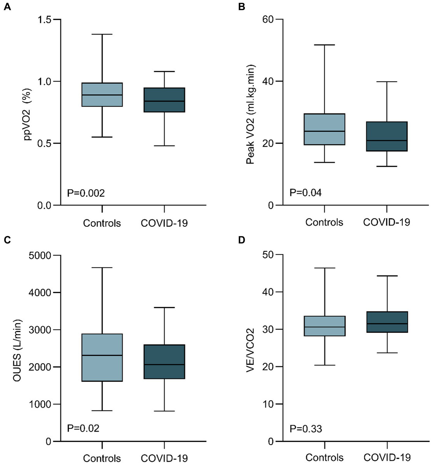 The study sample comprised 47 post-discharge COVID-19 patients and 141 healthy controls. The mean age of COVID-19 patients was 54 ± 14 years, with 19 (40%) females, and a mean body mass index of 31 kg/m2 (SD, 6). The median follow-up was 7 months (IQR, 6.5–8.0) after hospital discharge. PpVO2 in COVID-19 patients was lower than in controls (83% vs. 95%, p = 0.002) with an effect size of 0.38 ([95%CI], 0.04–0.70). Mean peak VO2 (22 vs. 25 mL/kg/min, p = 0.04) and OUES (2,122 vs. 2,380, p = 0.027) were also reduced in the COVID-19 patients in comparison to controls. Dysfunctional breathing (DB) was present in 51%. HRQoL was significantly reduced in post COVID patients and positively correlated to peak exercise capacity.