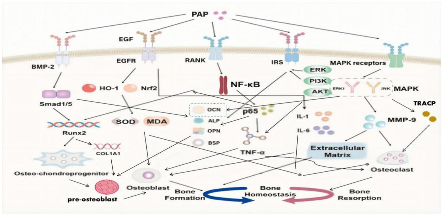 PAP has a significant anti-inflammatory and antioxidant effect through the EGF/EGFR signaling pathway, not only protecting osteoblasts and promoting bone formation but also inhibiting the induction of inflammatory and oxidative factors on osteoclasts, thereby reducing bone resorption (48):