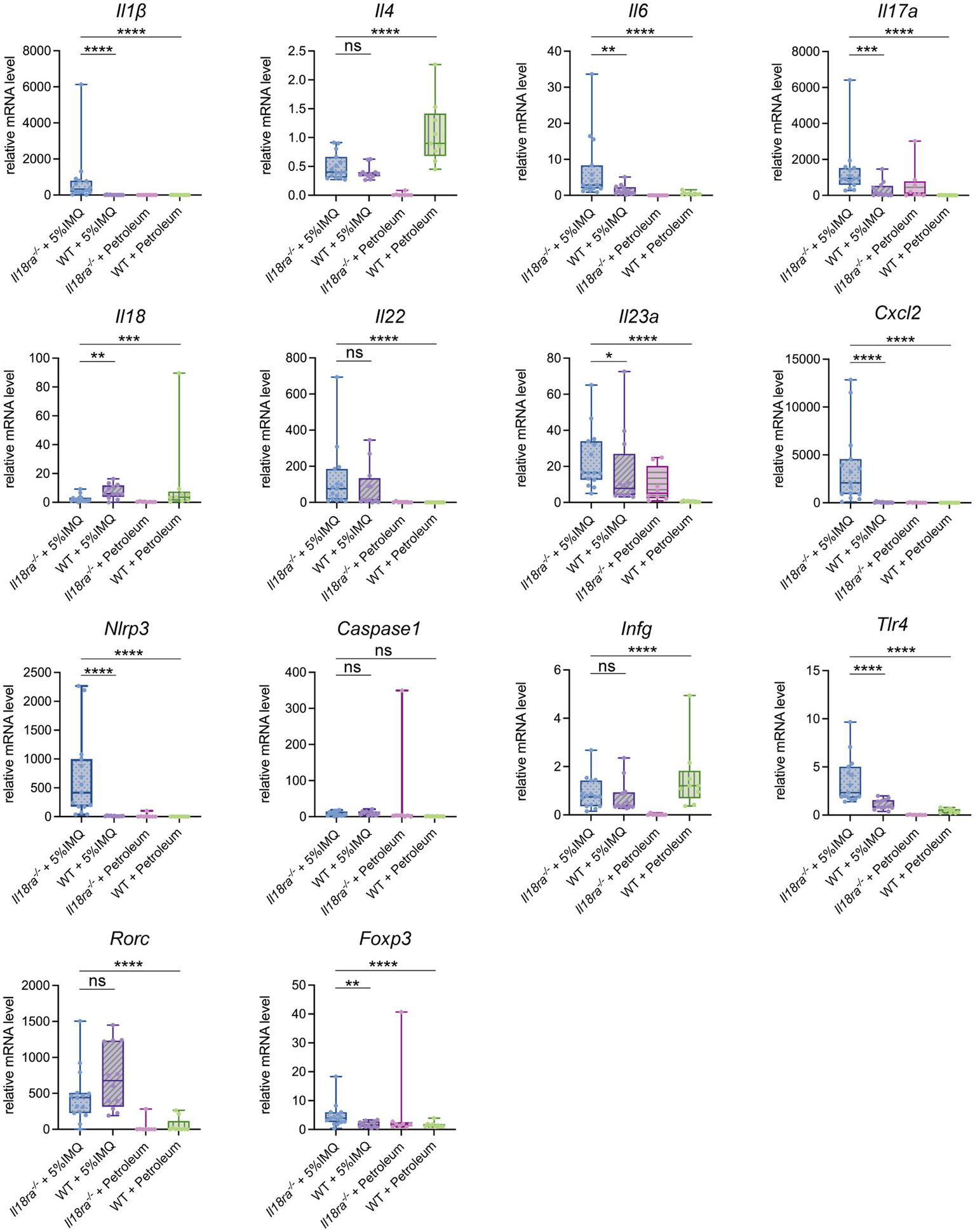 Effects of Il18ra-mediated signaling on cytokines and chemokines in dermatitis. Gene expression levels of cytokines, chemokines, transcription factors, Toll-like receptor and inflammasome related proteins in skin lesions were measured by real time PCR. The expression levels were normalized to the expression of Rn18s and are expressed relative to the values in untreated control mice. The expression in skin lesions of cytokines involved in the pathogenesis of psoriasis, such as I17a and Il23a, and chemokines that induce neutrophils to enter lesions, such as Cxcl2, was significantly increased in the IL18ra−/− group. In addition, there were also differences in the enhancement of cytokines such as Il1β and Nlrp3, which are involved in the process and outcome of inflammasome activation, suggesting that their activation may be more strongly involved in the exacerbation of dermatitis in the IL18ra−/− group than in the WT. The data are expressed as mean ± SD. *p < 0.05, **p < 0.01, ***p < 0.001, ****p < 0.0001. Il1β, interleukin-1 be-ta; Il4, interleukin-4; Il6, interleukin-6; Il17a, interleukin-17a; Il18, interleukin-18; Il18ra, interleukin-18 receptor alpha; Il22, interleukin-22; Il23a, interleukin-23a; Cxcl2, chemokine (C-X-C motif) ligand 2; Nlrp3, nucleotide-binding domain and leucine-rich repeat pyrin containing protein-3; Ifng, interferon gamma; Tlr4, Toll like receptor 4; Rorc, retinoic acid receptor-related orphan receptor-gamma t; Foxp3, Forkhead box protein 3; WT, wild type; IMQ, imiquimod.