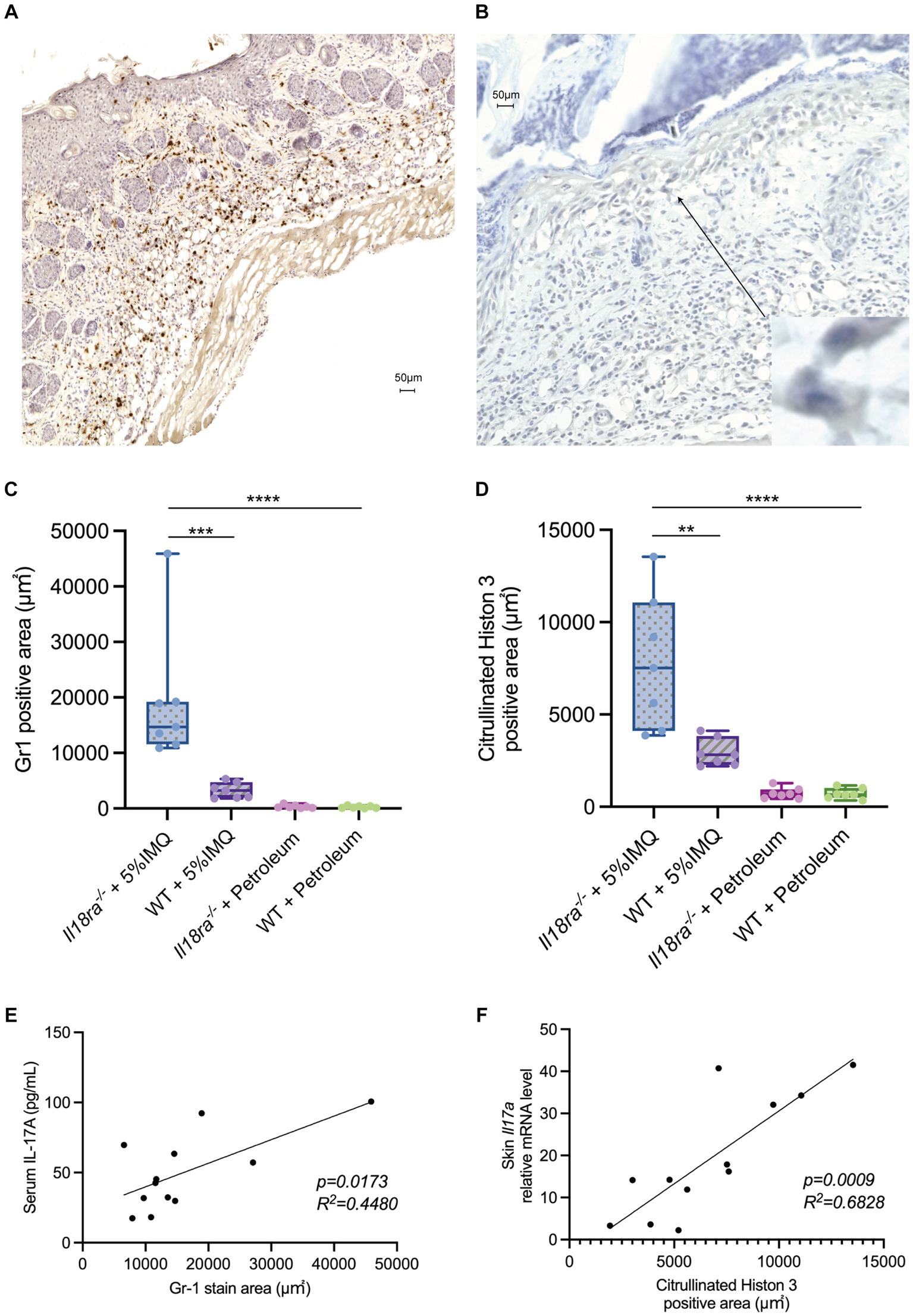 Il18ra-mediated signals may suppress IL-17 production by neutrophils activation. Infiltration of Gr1 positive cells and citrullinated histon 3 (NETs) into skin tissues of Il18ra−/− applied IMQ (A,B). Photomicrographs were taken at 10× magnification to compare the area of Gr1 positive cells and NETs infiltration into skin lesions between Il18ra−/− and WT mice treated with IMQ. Increased infiltration of Gr1 positive cells and NETs in Il18ra−/− were observed (C,D: n = 7). Gr1 positive cell infiltration and serum IL-17A levels correlate moderate and NETs and Il17a mRNA levels in skin lesion also have correlation (Gr1, R2 = 0.4480, p = 0.0173; NETs, R2 = 0.6828, p = 0.0009) (E,F: n = 12). The data are expressed as mean ± SD. *p < 0.05, **p < 0.01, ***p < 0.001, ****p < 0.0001. IL-17A, interuikin-17A; l18ra, interleukin-18 receptor alpha; NETs, neutrophil extracellular traps; WT, wild type; IMQ, imiquimod.