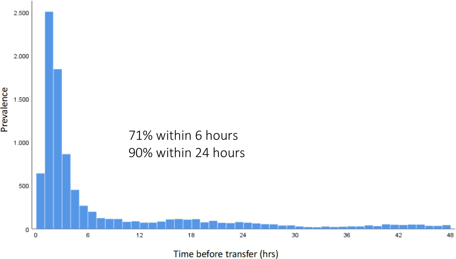 Figure 2. Time until transfer (hours) in all patients transferred out within 48 h after admission. The average and median time until transfer was 7.9 and 2.8 h, respectively.