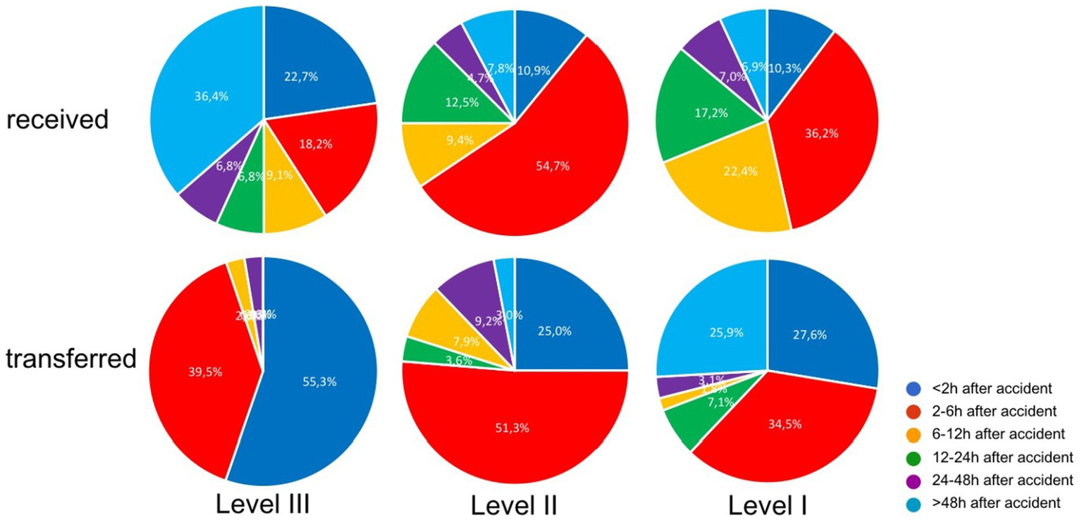 The data analysis of the questionnaire showed that the majority of patients were estimated being transferred within 2–6 h after accident (rapid/early transfer) (Figure 3). The Level-III Trauma Centers showed the highest rate of rapid transfer (94.8% < 6 h). If Level-III Trauma Centers had received patients to their hospital, they mostly received “late transferred” patients (50% after >24 h) (See Figure 4).