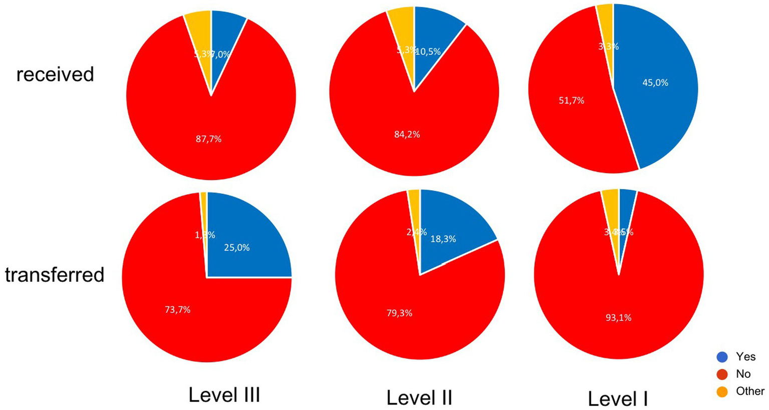 Out of the replies from the questionnaire the main reason for transfer (83.6%) were medical specialty (i.e., neurosurgery, cardio-thoracic-surgery, burns) for Level III and II Trauma Centers followed by transfer due to overall higher level of trauma care and capacity problems in ICU or OR. Capacity problems were also a top 4 reason for transfer out of Level I Trauma Centers as well as repatriation, which was as well a frequent reason for receiving transferred patients in Level-III Trauma Centers (Table 3).