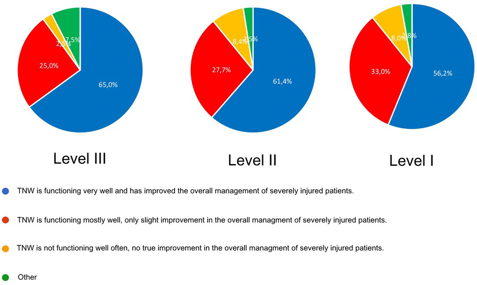 The participating trauma centers were asked if they felt that overall TNW had improved the care of severely injured patients. Most participants judged that TNW was functioning mostly or very well with some improvement of the overall management Many trauma centers judged that implementation of TNW improved trauma care significantly (Figure 5).