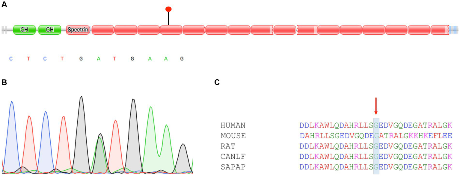 Characteristics and validation of SPTB mutation. (A) Diagrammatic representation of SPTB with known protein domains. The mutation c.2303G>A (p.G768D) found in this study had been indicated. (B) Sanger sequencing confirmed SPTB mutation. (C) Multiple sequence alignment of homologs from different species. Conservative regions were marked.