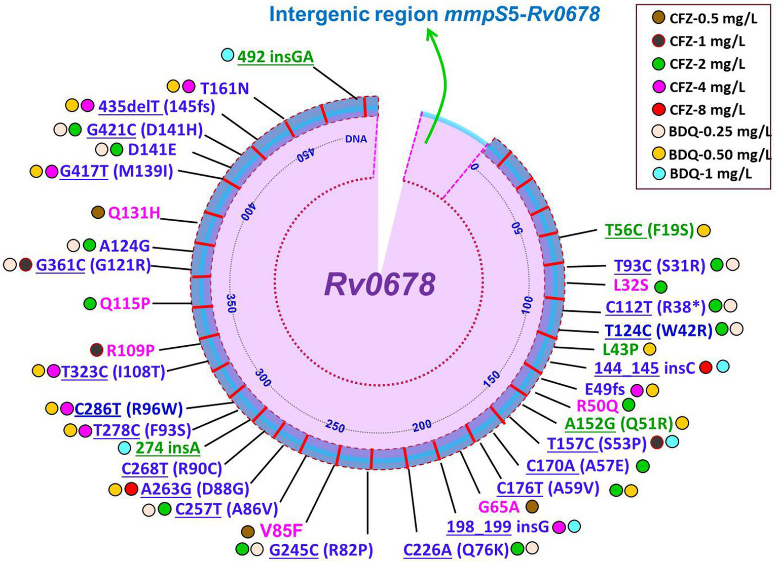 Schematic illustration of recently identified mutations in Rv0678 associated with individual resistance or cross-resistance to BDQ and CFZ in Mtb clinical isolates. Blue color mutations indicated cross-resistance; Magenta color mutations indicated resistance only for CFZ; Green color mutations indicated resistance only for BDQ; Underline mutations indicated DNA and without underline indicated amino acids; *indicated stop codon (8, 22, 50, 55, 56, 87, 88, 90, 91).