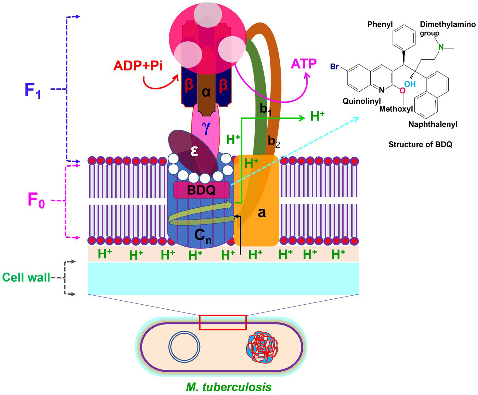 BDQ is closely linked to FQs and chloroquine, albeit it has a distinct side-chain moiety. The mechanism of action of BDQ is different from FQs, and it has no inhibitory effects on DNA gyrase. Energy metabolism enzymes in Mtb for the development of drugs/compounds, such as F0F1 (F0, a rotor and F1, a stator) and the respiratory chain complexes, have been proved as new promising targets. Among the class of bioenergetics inhibitors, BDQ was the first drug approved by the United States FDA and the European Medicines Agency (103, 104). According to reports, BDQ interacts with the F0 domain to specifically target F0F1 of Mtb (105). As a result, ATP generation is inhibited, and ATP levels drop significantly. The ATP synthase enzyme consists of two sectors: the membrane sector F0, which contains three subunits (a, b2 and cn), and the cytoplasmic sector F1, which has five subunits (3α, 3β, γ, δ, and ε). The subunits c of F0 are organized in the shape of disks and serve as an ion-conducting route, while ADP and phosphate (Pi) are combined at three catalytic sites in F1 to generate ATP (104). It is widely known that BDQ has the ability to attach the subunit c in the F0 rotor ring of the ATP synthase and inhibit its function (Figure 4). In addition, BDQ has also been showed to prevent ATP synthesis via a second targeting binding site in the ε subunit on the mycobacterial F0F1-ATP synthase and prevent to generate ATP (106).