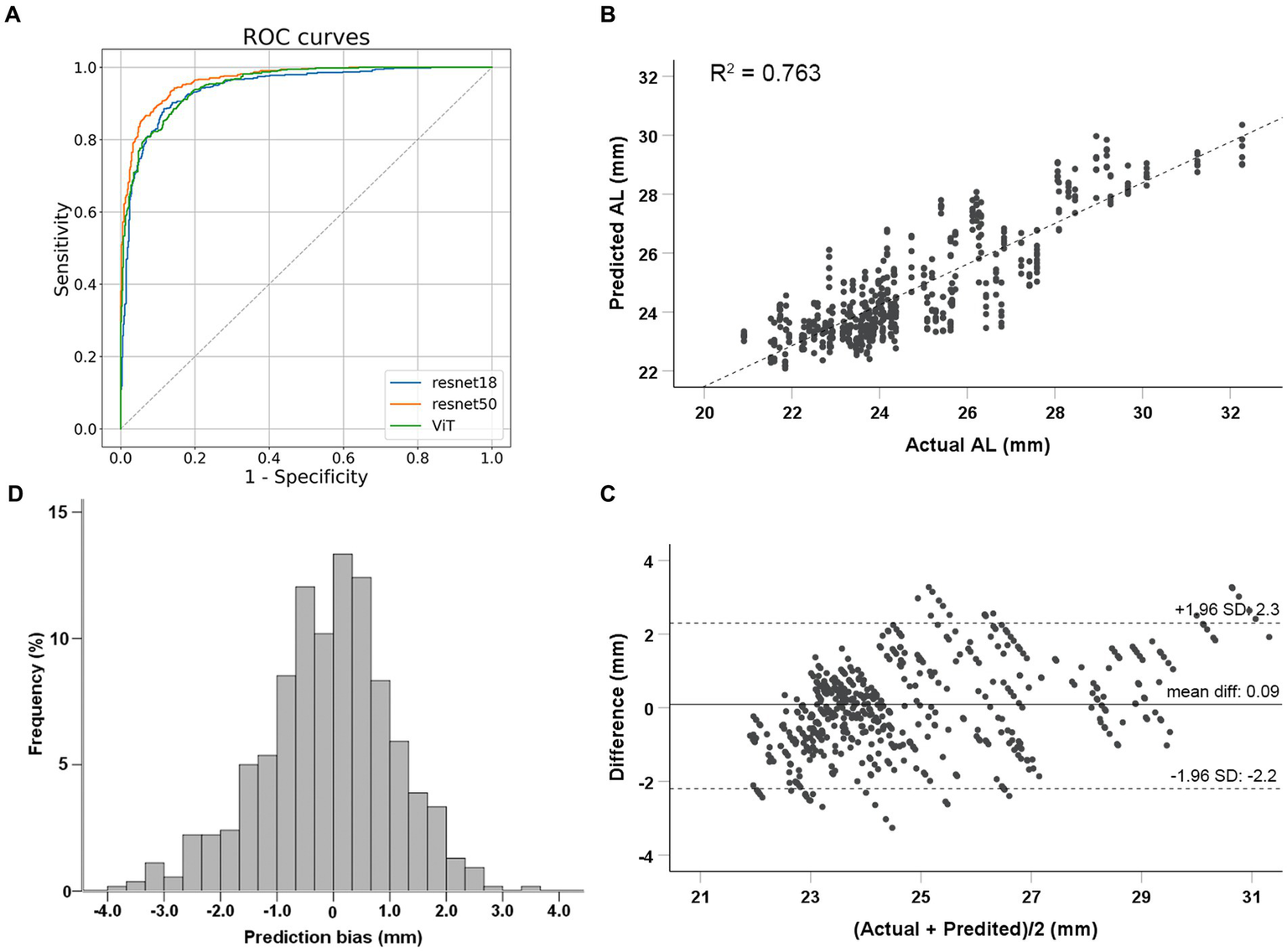 Performance evaluation of deep learning models. (A) Classification performance of deep learning models to identify eyes with axial lengths ≥26.0 mm in the test dataset. (B) Correlations between actual and predicted axial length using the ResNet 50 model. (C) Bland–Altman plots for the real and predicted axial length using ResNet 50 in test dataset. (D) Prediction bias frequency distribution.