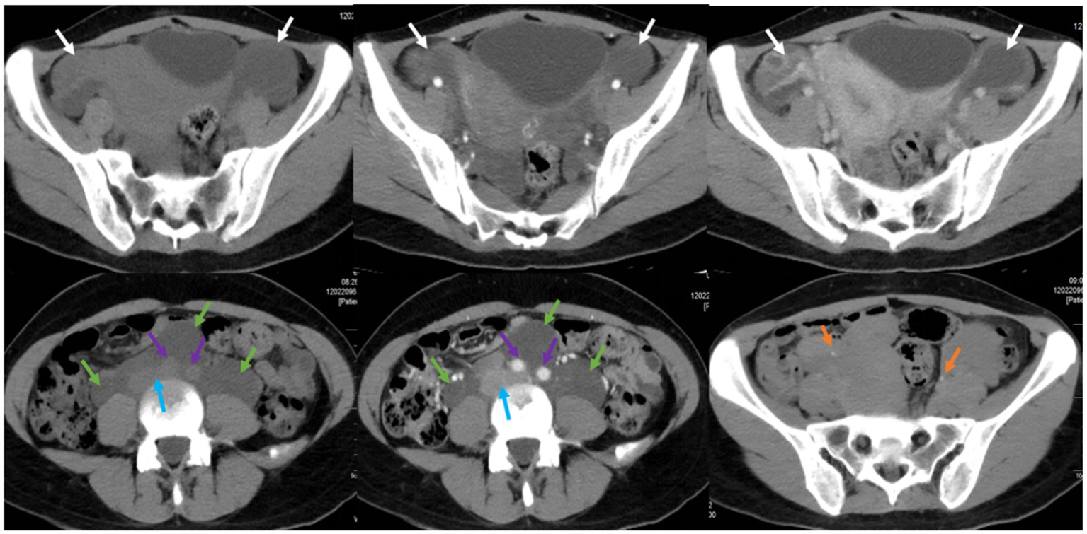 Pelvic CT plain scan and enhancement in a pregnant woman seen at Shanghai First Maternity and Infant Hospital Affiliated with Tongji University. The white arrow points to bilateral ovaries, the green arrow points to the cystic-solid mass, the blue arrow points to the abdominal aorta, the purple arrow points to the inferior vena cava and iliac vessels, and the yellow arrow points to the ureters.