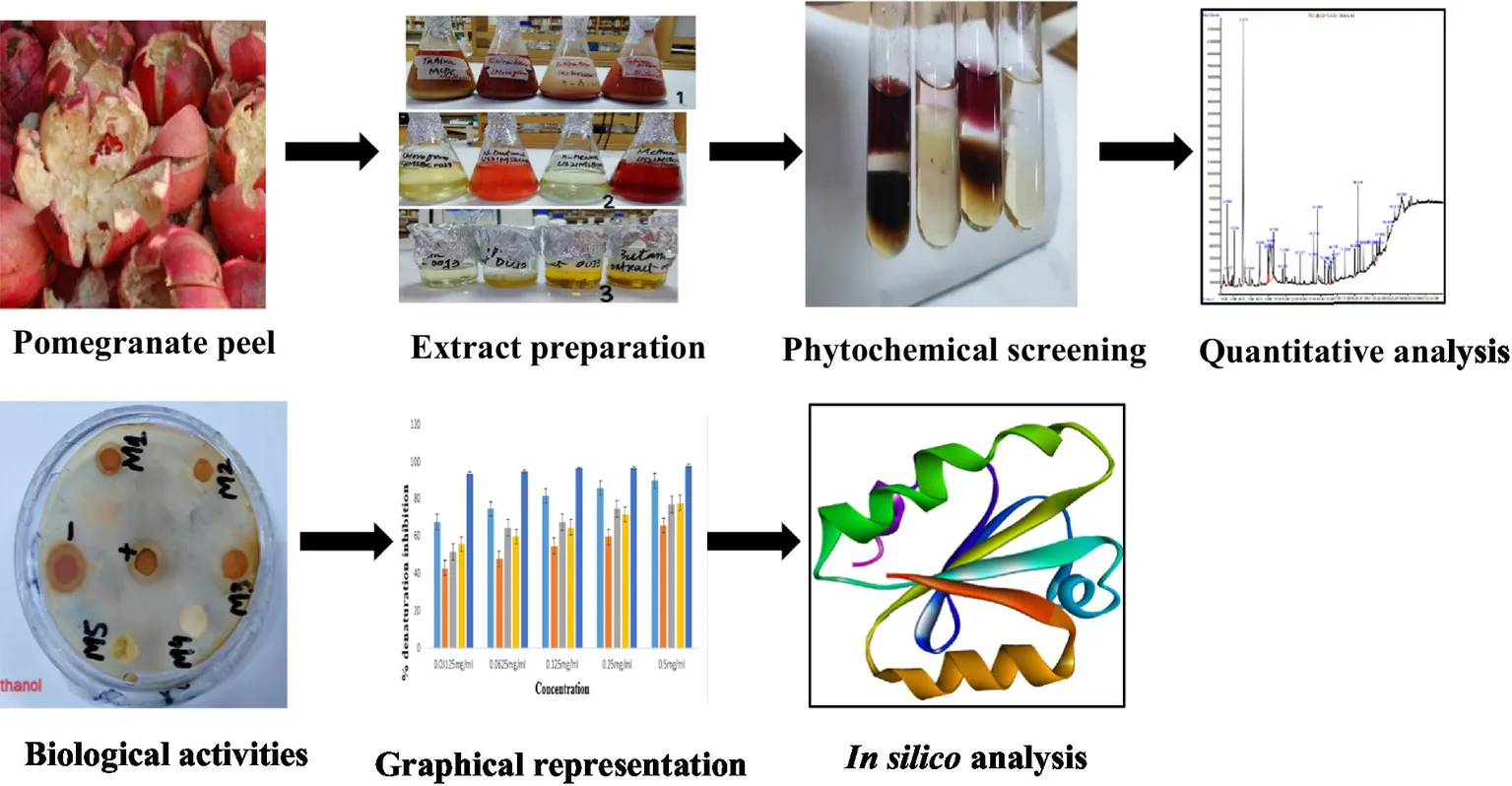 The bioactive compounds of the peel have shown antioxidant, antimicrobial, antidiabetic, and anti-inflammatory properties in various research, indicating their therapeutic effects in different diseases such as ethanol-acetone ulceration, gastro-mucosal injuries, diabetic oxidative damage, and leukemia chemoprevention. Precipitation of membrane proteins that results in microbial cell death is the mechanism through which peel phenolics exhibit their antibacterial effect. Peel anti-mutagenic and antibacterial characteristics are part of its ethno-medicinal profile that makes its traditional value. Furthermore, phytochemicals present in the peel are effective without adding extracts from any other fruit components (26). The pomegranate fruit and its derivatives may contain medicinal value with significant phytochemicals and secondary metabolites, according to previous research. Oxidative food stability can be maintained by using peel extract. Litopenaeus vannamei is prevented using peel extract in methanol as it works like a natural preservative. Two doses of peel extracts of 10 or 20 g significantly inhibit the growth of Enterobacteriaceae, psychrophilic, mesophilic, and lactic acid bacteria (LAB) in white shrimps. Pomegranate peel stabilizes shrimp quality and is used to decrease thiobarbituric, trimethylamine, and total volatile basic nitrogen. It is used to preserve Kalari cheese in India. The peel inhibits the production of coliform during preservation because fungus, yeast, and psychrophilic quantities are inhibited by peel extracts. The aims and objectives of the research include the preparation of extracts in different solvents such as methanol, chloroform butanol, and n-hexane. Phytochemical identification was done and gas chromatography-mass spectrometry (GC-MS) analysis of extracts was performed. The biological activities of the peel were determined. In silico studies were performed to design drugs against diabetes (8).