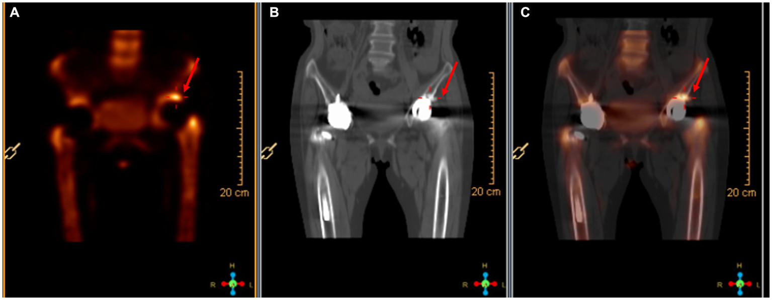 Radionuclide bone imaging. (A) The bone metabolism around the left femoral stem was increased. (B) The blood flow phase was normal. (C) The radioactive uptake in the blood pool phase was increased.