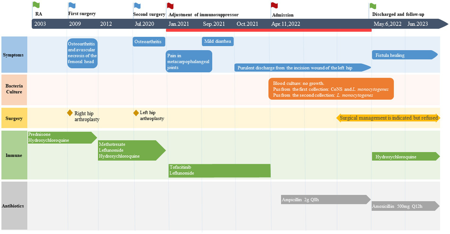 L. monocytogenes is an intracellular facultative pathogen, and the human immune response to it mainly depends on adaptive immunity mediated by T lymphocytes induced by dendritic cells. These T lymphocytes secrete IL-18, interferon-γ, perforin, and lysozyme, which stimulate macrophages to produce tumor necrosis factor and nitric oxide and to perform phagocytosis. Nevertheless, it is important to note that L. monocytogenes secretes Listeriolysin O, a pore-forming toxin. This toxin can induce T cell receptor unresponsiveness by promoting the expression of negative regulators of the T cell receptor signaling pathway, thereby suppressing antigen-induced T cell activation and impairing the posttranslational modification of host cell proteins. Finally, the interference with the host immune response leads to the development of listeriosis (13). Leflunomide is a non-biological disease-modifying antirheumatic drug (DMARD), which is a selective inhibitor of de novo pyrimidine synthesis. It works by inhibiting the growth of immune cells, including those contributing to the inflammatory response. While it is beneficial for managing autoimmune disease symptoms, it can also reduce the body’s ability to fight off infections. Common infections associated with leflunomide use include respiratory tract infections, urinary tract infections, as well as skin and soft tissue infections. However, there have been no reported cases of prosthetic joint infection with leflunomide. On the other hand, tofacitinib, as a JAK inhibitor, can theoretically inhibit the development and/or maintenance of pathogen-specific memory T cells by inhibiting the intracellular signaling of IL-12, interferon-γ, and other related cytokines (3). Opportunistic infections, including tuberculosis, Pneumocystis carinii pneumonia, and cryptococcosis, have been proposed to be associated with the use of JAK inhibitors, but the mechanisms have not been elucidated. It is hypothesized that tofacitinib may disrupt the normal functioning of key components involved in adaptive immunity, thereby impacting its overall effectiveness (14). It has been proposed that the transcriptional response to L. monocytogenes infection requires a cooperative signal of type I interferon (IFN-I) -stimulated JAK–STAT and proinflammatory NF-κB pathways. In other words, if there is inhibition of the JAK–STAT pathway, then the transcriptional response to Listeria infection may be impaired and listeriosis may be more likely to develop (15). Before this, we summarized the types of targeted therapies and Listeria infection, including Anti-TNF-α monoclonal antibodies, Anti-CD52 monoclonal antibodies, Anti-CD20 monoclonal antibodies, Anti-IL-6 receptor monoclonal antibody, EGFR/HER2 pathway inhibitors, Anti-CD38 monoclonal antibody and protease inhibitors. Most cases of Listeria infection have been associated with the use of anti-TNF-α therapy (16). However, in an open-label randomized controlled trial involving rheumatoid arthritis patients on Tofacitinib therapy, the risk of opportunistic infections was found to be even higher than that observed in patients receiving anti-TNF-α therapy (17).