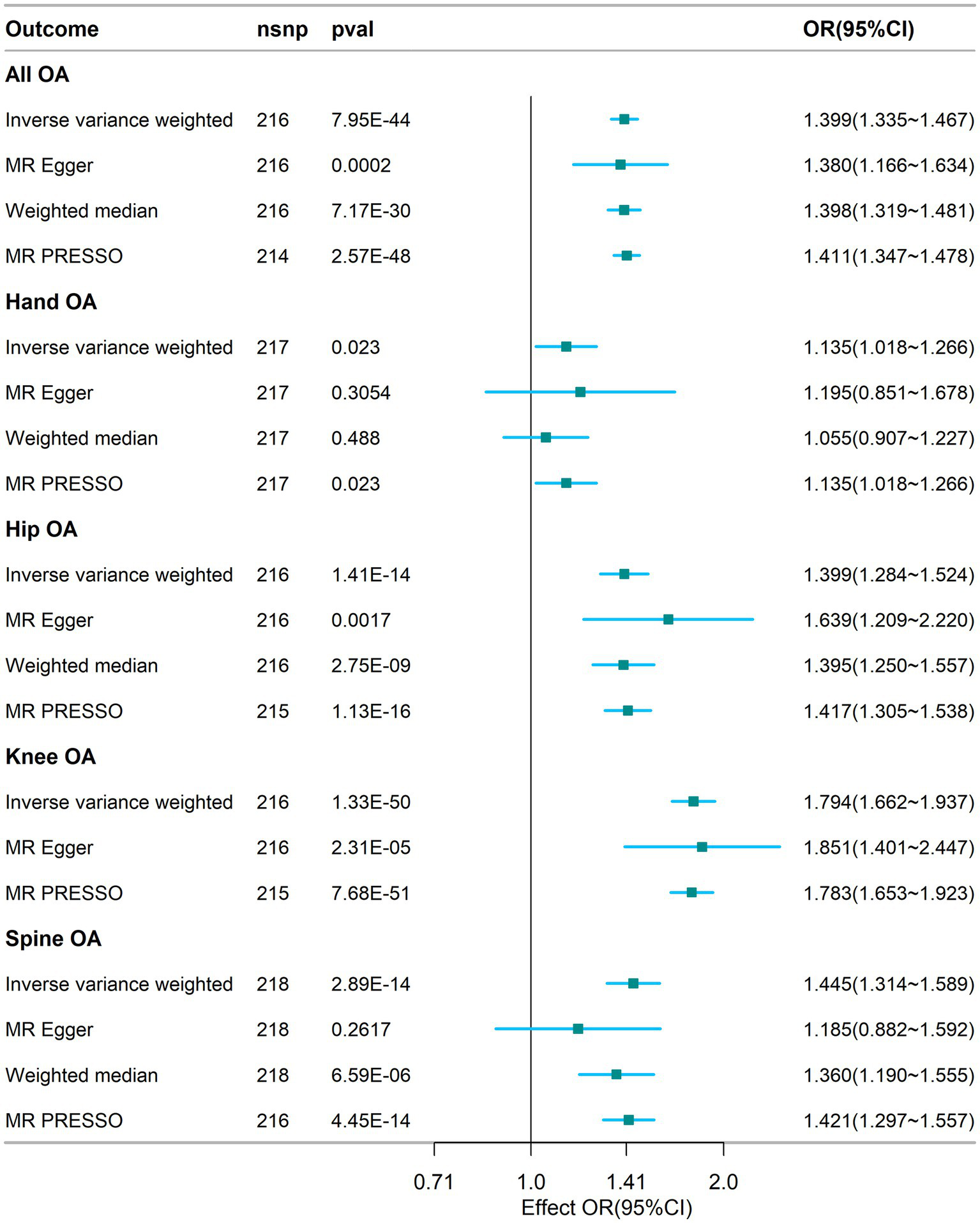 Results: Our findings indicated that visceral adipose tissue was associated with all osteoarthritis, hip osteoarthritis, knee osteoarthritis, and spine osteoarthritis (all osteoarthritis: OR = 1.399, 95% CI: 1.335–1.467, p = 7.95e-44; hip osteoarthritis: OR = 1.399, 95% CI: 1.284–1.524, p = 1.41e-14; knee osteoarthritis: OR = 1.794, 95% CI: 1.662–1.937, p = 1.33e-50; and spine osteoarthritis: OR = 1.445, 95% CI: 1.314–1.589, p = 2.89e-14). Sensitivity analysis demonstrated the reliability of these results.