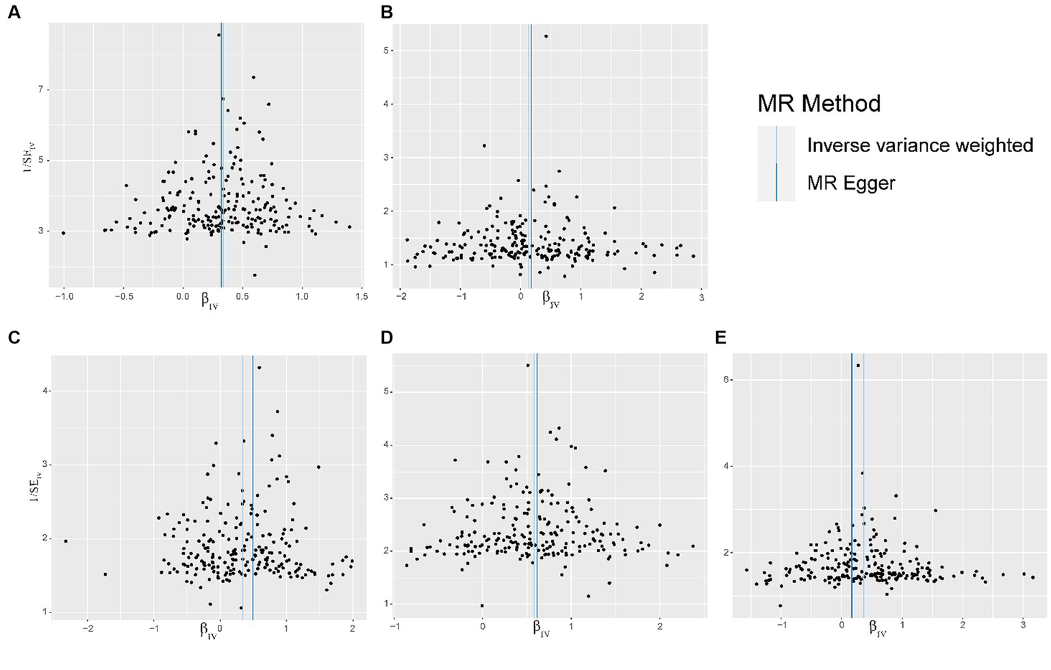 The results of sensitivity analyses are presented in Table 2, and in sensitivity analyses, the MR Egger intercept test was used to find potential horizontal pleiotropy. No horizontal pleiotropy was found with each MR analysis. The results of Cochran’s Q-test showed extensive heterogeneity. Because we used random effects IVW as the primary outcome, the heterogeneity was acceptable (20). In addition, no significant bias was observed in the funnel plots of each MR analysis (Figure 4).