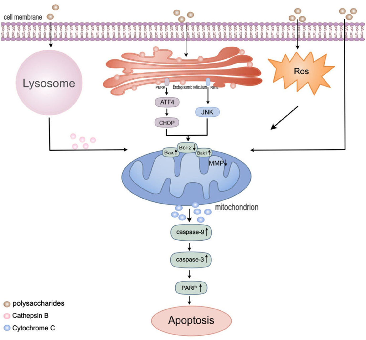 Regulation of apoptosis pathway in colon cancer cells by polysaccharides. Mitochondria play a significant role in regulating various cell death pathways, including apoptosis, autophagy, and ROS production. HEEPs were found to increase ROS levels. TPs were found to induce the release of tissue proteases from lysosomes. Lentinan, inducing autophagy and endoplasmic reticulum stress (ERS), following ERS stimulation, the PERK and IRE1α sensors located in the endoplasmic reticulum membrane dissociate from BIP and activate downstream signals such as ATF4, CHOP and JNK. Then, the level of pro-apoptotic protein Bak1 and Bax1was up-regulated and the level of anti-apoptotic protein Bcl-2 was down-regulated and caused a decrease in the mitochondrial membrane potential. Subsequently activate the caspase cascade reaction to induce cell apoptosis.