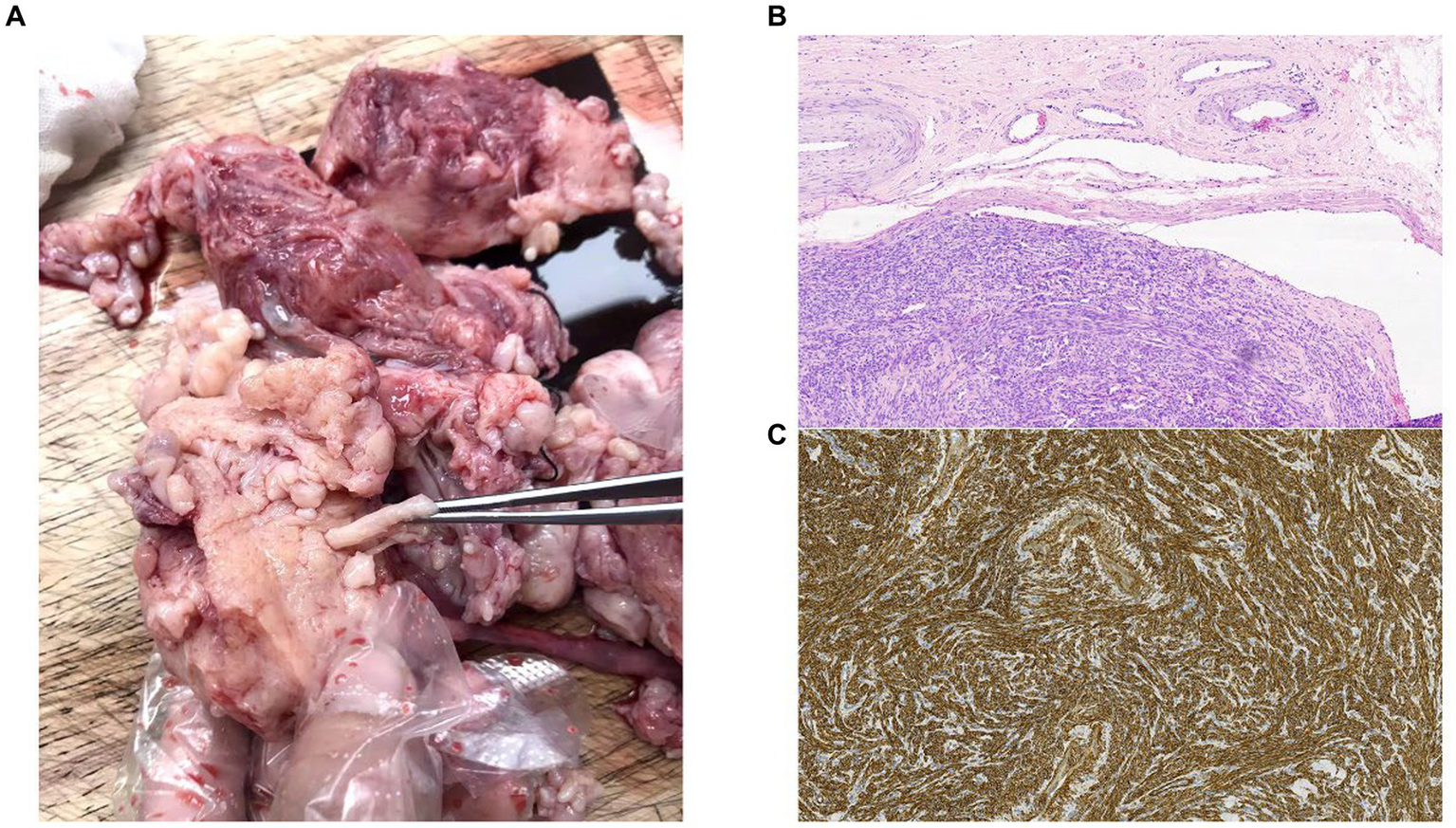 (A) Images from the operating theater. (B) Histology of the resected tumor at ×10 magnification. Intravascular tumor presents within the lumen of a vein, showing dense proliferation of uniform spindle-shaped smooth muscle cells. (C) The smooth muscle compartment is shown by h-caldesmon staining (h-caldesmon, 100×).