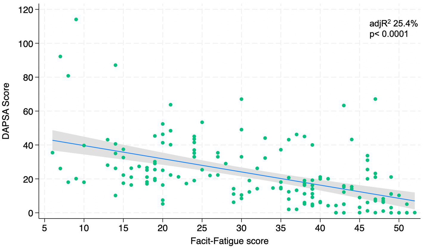Data were reported as percentages for categorical variables, and score values were represented as median (first quartile – third quartile). Statistical analysis was performed using the linear regression analysis to evaluate the relationship between DAPSA Score and all the included PROMs (HAQ, PsAID, FACIT-F and PHQ-9). We represented graphically our data by regression line with 95% confidence intervals and dots as data of each patient. Adjusted Rsquare was used to show the strength of association between variables. A two-tailed p < 0.05 was considered statistically significant. STATA [StataCorp.2021]. Stata Statistical Software: [Release 17, College Station, TX, United States: StataCorp LP] was used for database management and analysis.