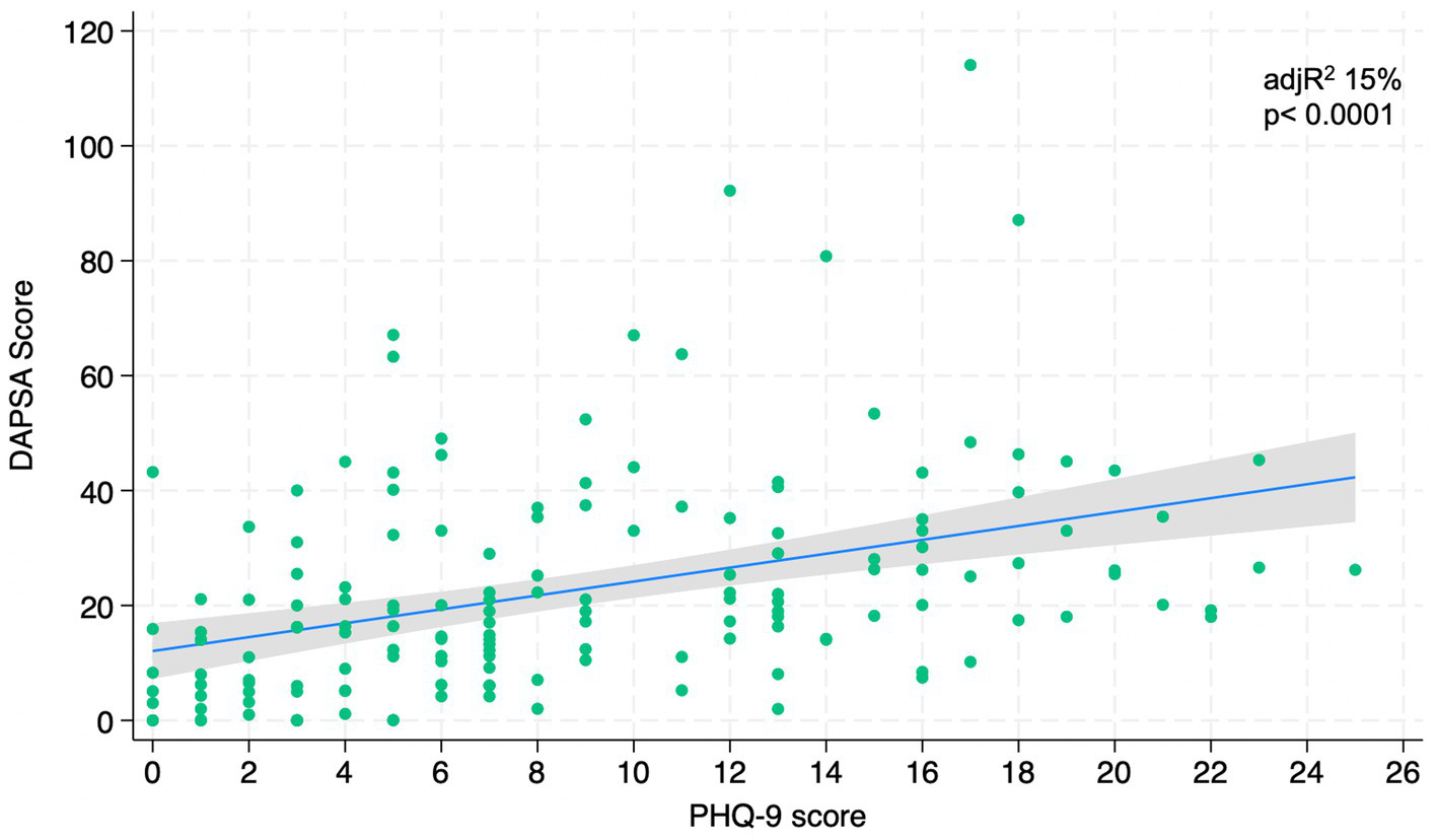 Linear relationships between DAPSA and PHQ-9.