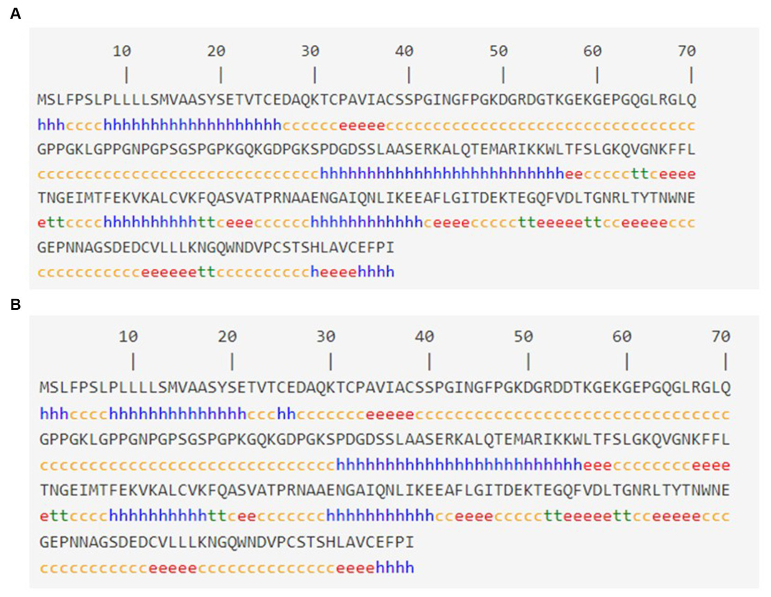 Secondary structure analysis: (A) Secondary structure with wild MBL protein and (B) secondary structure with MBL protein in case of the selected mutation, produced by the SOPMA server. Alpha helix: (h), Extended strand: (e), Beta turn: (t), Random coil: (c).