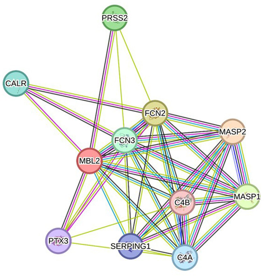 Protein–protein interaction network related to MBL protein, generated by the STRING databases (version 12). The nodes signify proteins, whereas the edges indicate protein–protein associations. The edges could possess any of the seven distinct colored lines, with distinct indications. Black lines: co-expression evidence; light blue lines: database evidence; yellow lines: text-mining evidence; purple lines: experimental evidence; blue lines: co-occurrence evidence; green lines: neighborhood evidence; red lines: fusion evidence. MASP2: Mannan-binding lectin serine protease 2 A chain, FCN2: Ficolin-2, MASP1: Mannan-binding lectin serine peptidase 1, PRSS2: Trypsin-2, FCN3: Ficolin-3, CALR: Calreticulin, C4A: Complement C4-A alpha chain, SERPING1: Plasma protease C1 inhibitor, PTX3: Pentraxin-related protein PTX, C4B: Complement C4-B alpha chain (https://string-db.org/ accessed on 23 December 2023).